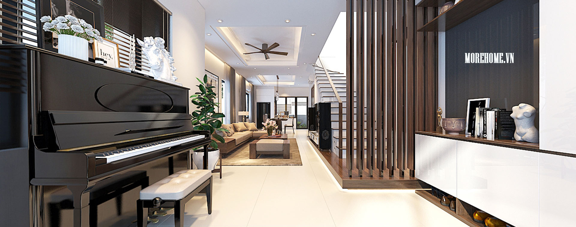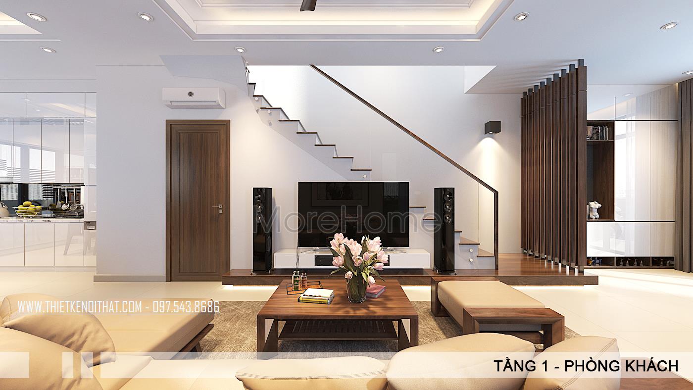 Nhìn vào không gian phòng khách này bạn có thể thấy được sự tối giản trong thiết kế của KTS Morehome. Phòng khách ngôi biệt thự có diện tích rộng, có độ thông thoáng cao nên các KTS đã lựa chọn một bộ sofa gỗ óc chso có kích thước lớn, được thiết kế tối giản các chi tiết rườm rà tạo nên vẻ đẹp hiện đại và vô cùng sang trọng.