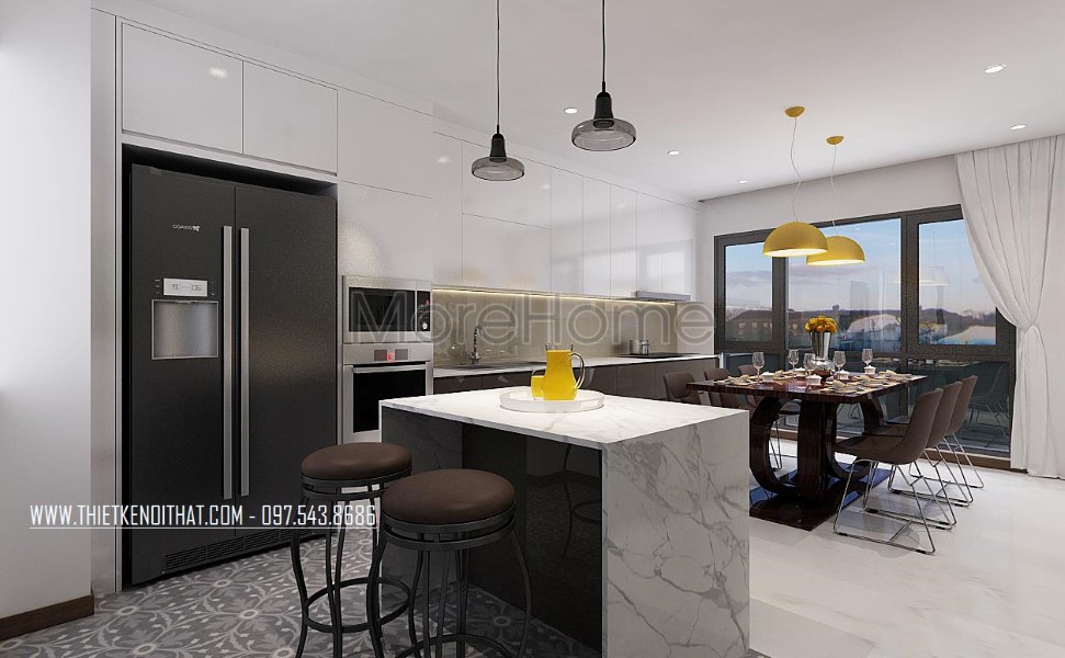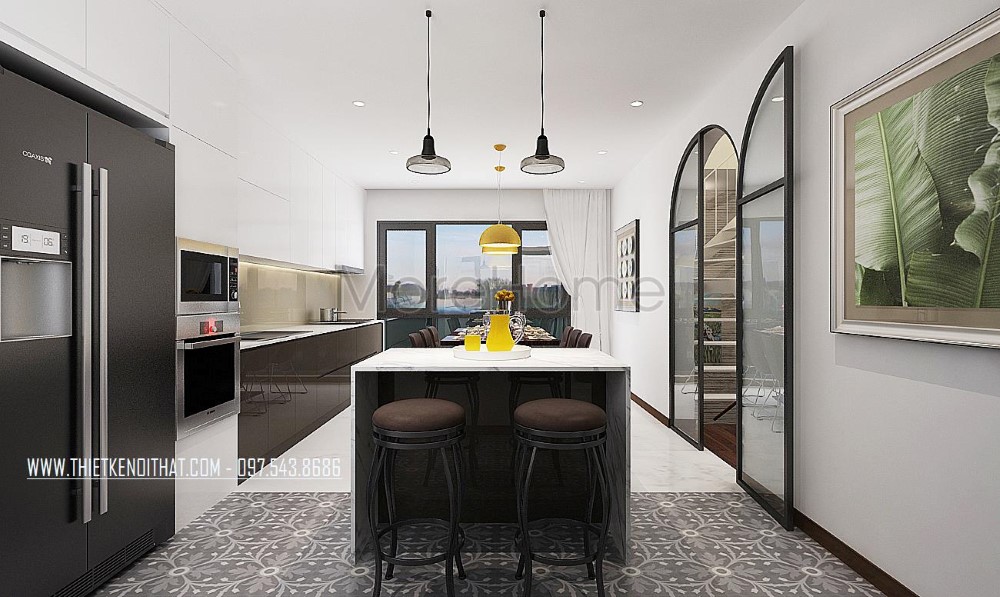 Cuối cùng là thiết kế nội thất bếp và bàn ăn hiện đại. Hai thiết kế này được sắp xếp liền kề mang lại cảm giác tiện nghi và mở rộng tầm quan sát, bao quát cho gia chủ. Thiết kế kệ và tủ bếp đơn giản, gần như tạo mặt phẳng ngang liền giúp tiết kiệm không gian. Thiết kế không hề nhấn mạnh đến các chi tiết trang trí cầu kỳ và tập trung hơn vào tính công năng và sự thuận tiện. Bàn ăn được thiết kế đơn giản, không gian đủ rộng cho các bữa cơm hay sinh hoạt ấm cũng của gia đình. Ngoài ra, các điểm nhấn màu sắc từ đèn trang trí hay các vân gỗ trên bàn ăn cũng góp phần tăng thêm sức cuốn hút cho không gian.