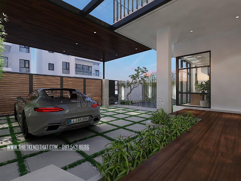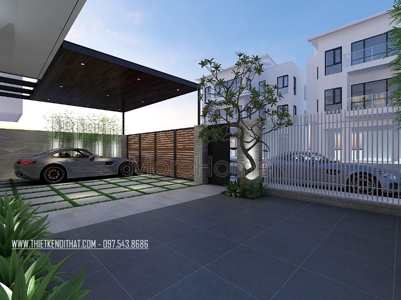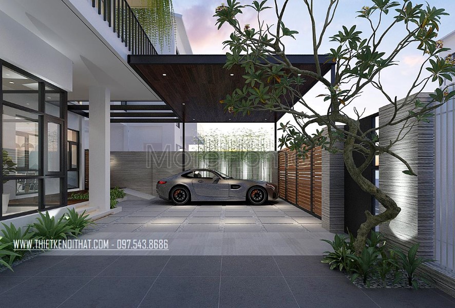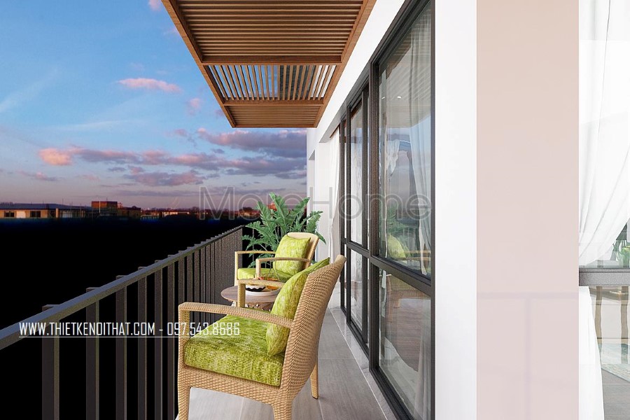 Thiết kế không gian ban công mở là nơi thu hút nhất đối với gia chủ. Với đặc điểm view rộng với không gian vô cùng dễ chịu giúp gia chủ thư giãn sau một ngày dài làm việc. Thiết kế ghế tựa sử dụng vật liệu tre đan khá đơn giản và tiện dụng, dễ dàng thay thế, di chuyển khi cần thiết. Phía trên mái che là thiết kế thanh ngang gỗ xếp ấn tượng vừa đảm bảo tính công năng lại tạo điểm nhấn cho thiết kế.
