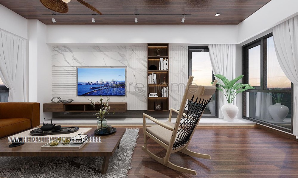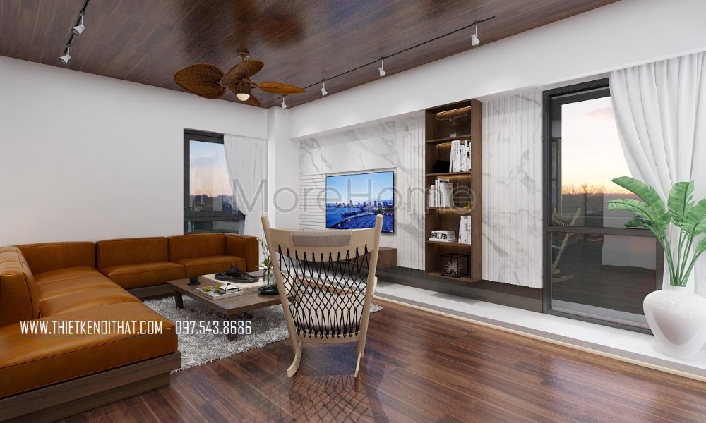 Thiết kế nội thất phòng khách mang phong cách hiện đại ấm áp. Tone màu nâu và vàng da bò ấm áp là màu sắc được ưu ái sử dụng trong thiết kế này. Bộ sofa được lựa chọn có diện tích to bản, tạo thế vững chắc, an toàn. Ngoài ra, thiết kế trần nhà đơn sắc hay sử dụng ánh sáng ấm trần đã trở nên quá phổ biến, vì vậy kiến trúc sư đã khéo léo thay đổi thành thiết kế gỗ ốp tone màu nâu veneer ấm áp, vừa đảm bảo màu sắc cân bằng, hài hòa, vừa tạo điểm nhấn cho không gian sinh hoạt chung.