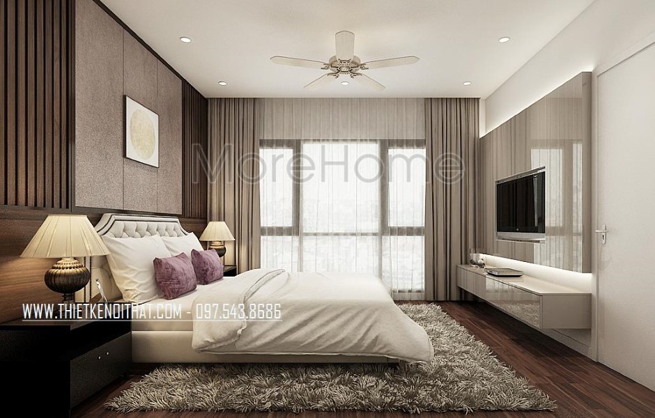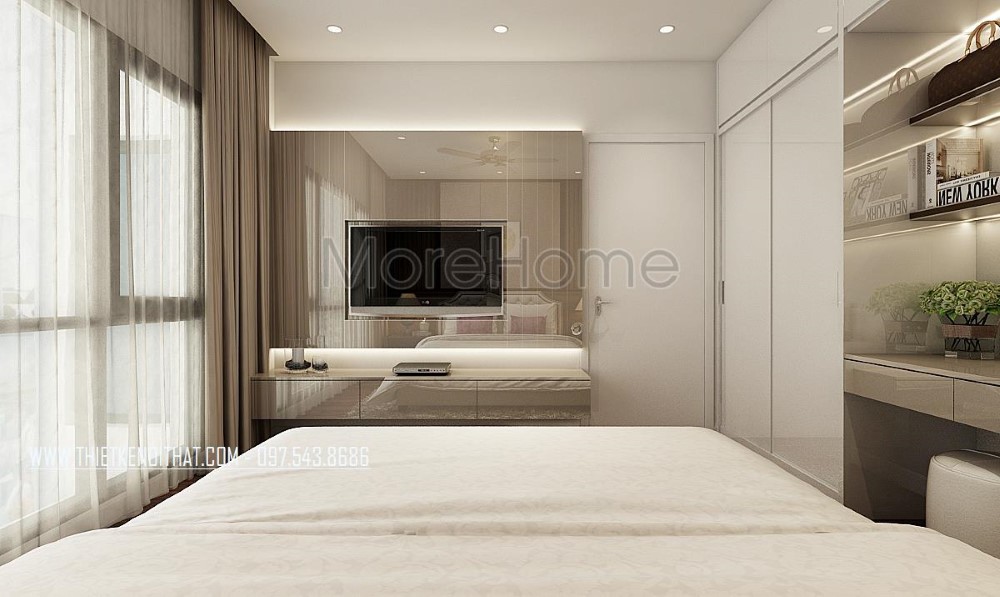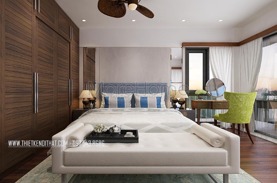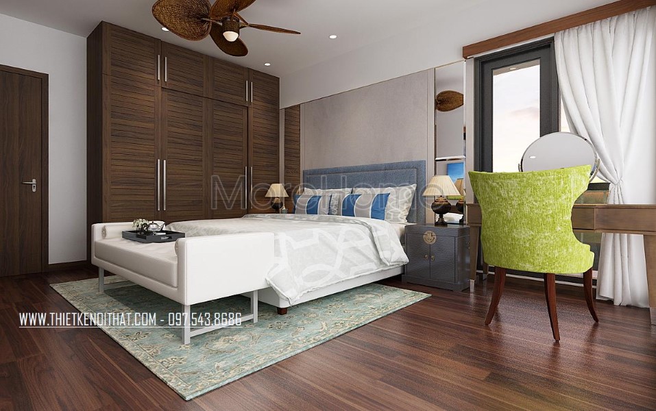Tiếp theo là thiết kế nội thất không gian phòng ngủ. Nội thất phòng ngủ lấy điểm nhấn màu sắc là tone màu nâu ấm áp. Đây là một trong những tone màu mang lại hiệu ứng cảm xúc tích cực cho gia chủ, gợi mở một không gian vô cùng gần gũi và yên bình. Thiết kế tủ gỗ gần như âm tường là một trong những điểm đặc biệt giúp không gian trở nên mở và thoáng hơn rất nhiều. Bên cạnh đó, thiết kế kết hợp kệ và ngăn chứa đồ là một ý tưởng không tồi mang đến sự tiện nghi cho gia chủ.