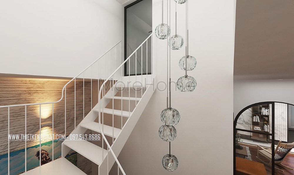 Thiết kế nội thất biệt thự Xuân Phương là sự kết hợp hài hòa của các thiết kế mang vẻ đẹp phá cách và hiện đại. Điển hình là cầu thang được sử dụng vật liệu mới lạ. Thay vì việc ứng dụng cấu trúc build-in cứng nhắc thì kiến trúc sư lại khéo léo sử dụng vật liệu nhẹ, tạo không gian mở và khoảng trống giữa các bậc thang góp phần lớn tăng độ thoáng và mở cho thiết kế.