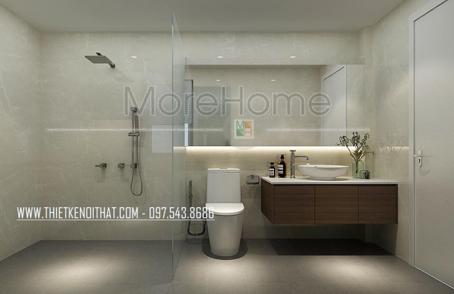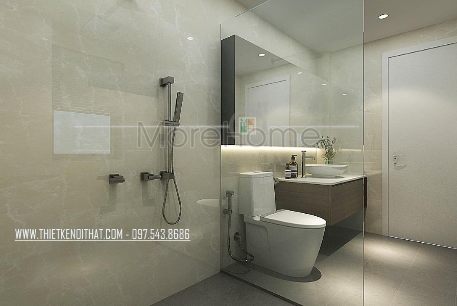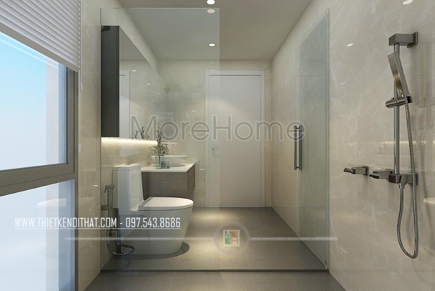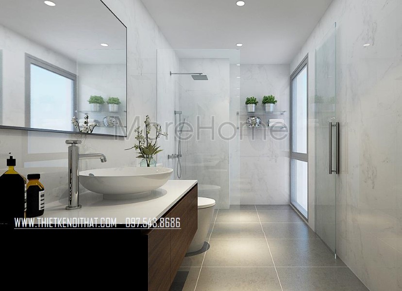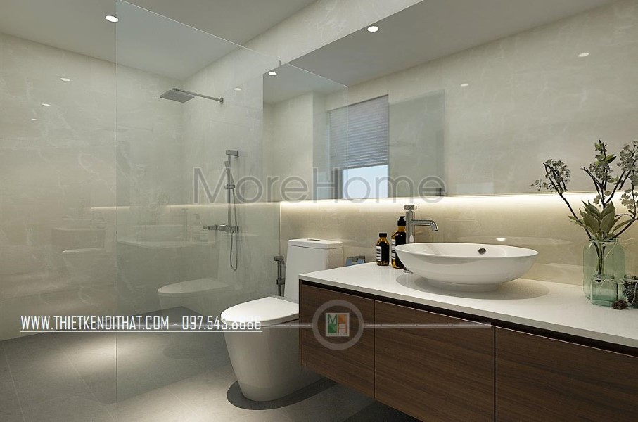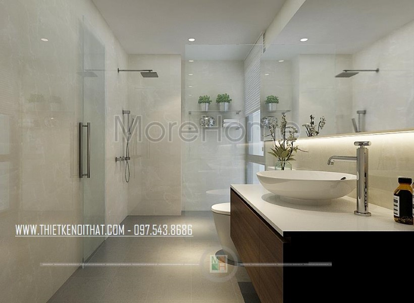 Căn phòng tắm kết hợp nhà vệ sinh là một trong những không gian thiết kế ấn tượng của căn biệt thự. Đối với nhiều người phòng tắm không hề là một không gian phụ, thiết kế nội thất phòng tắm luôn đòi hỏi một sự hài hòa và cân bằng tuyệt đối, từ đó mang đến gia chủ cảm giác an toàn, dễ chịu, và an nhiên. Thiết kế nội thất sử dụng các vật liệu nhẹ là chủ yếu như kính cường lực trong suốt, đá tự nhiên, gạch ốp, hay gương phản chiếu,… tất cả đều có độ phản chiếu ánh sáng nhẹ giúp tạo cảm giác cơi nới cho không gian hẹp, và tăng độ mở cho căn phòng.