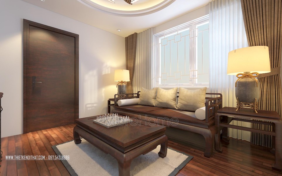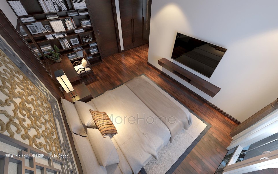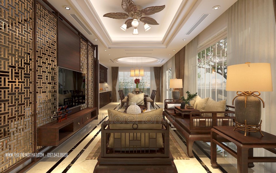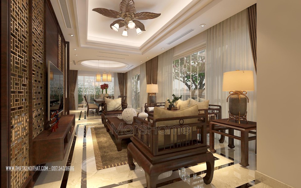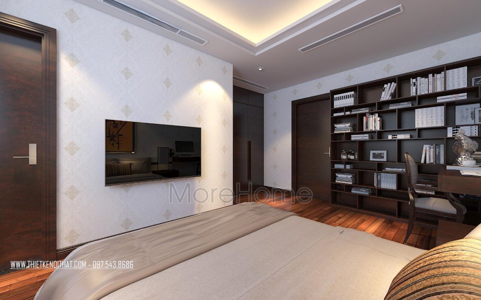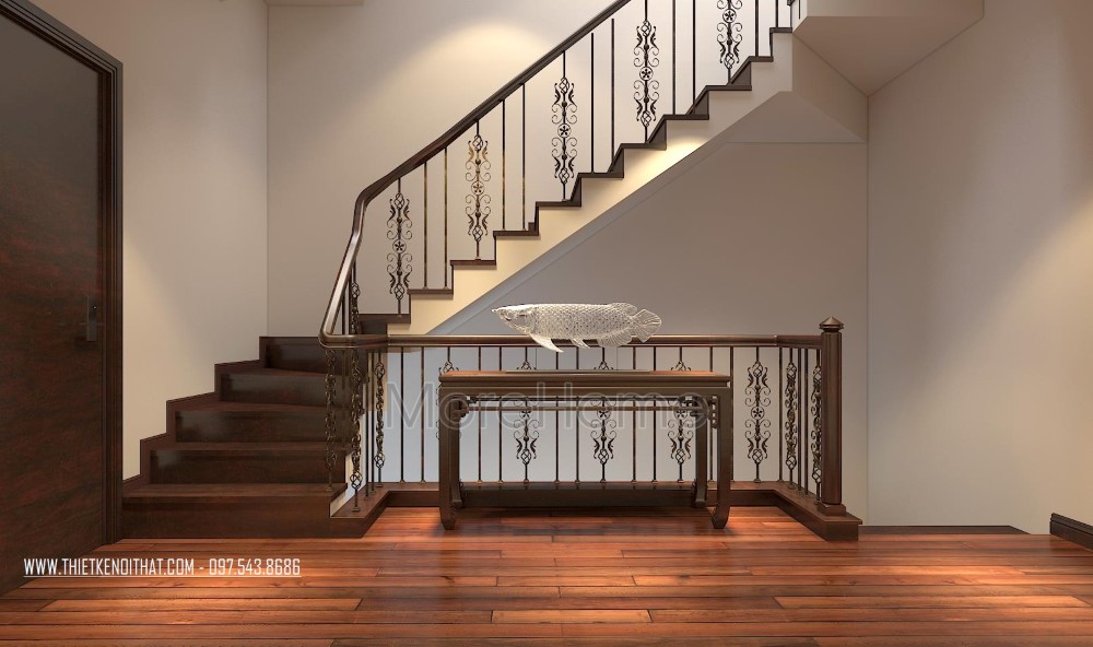 Một điểm đặc biệt không thể không nhắc đến chính là thiết kế bức vách ngăn khéo léo tạo một mặt phẳng ấn tượng. Thiet ke noi that biet thu Vinhomes Thang Long này không những đảm bảo tính rõ ràng trong thiết kế, giúp phân chia không gian một cách hợp lý, bên cạnh đó còn góp phần lớn giúp tạo điểm nhấn về mặt thẩm mỹ. Cách tạo hoa văn không quá cầu kỳ nhưng vô cùng hút mắt, để lại ấn tượng tốt cho cả không gian.