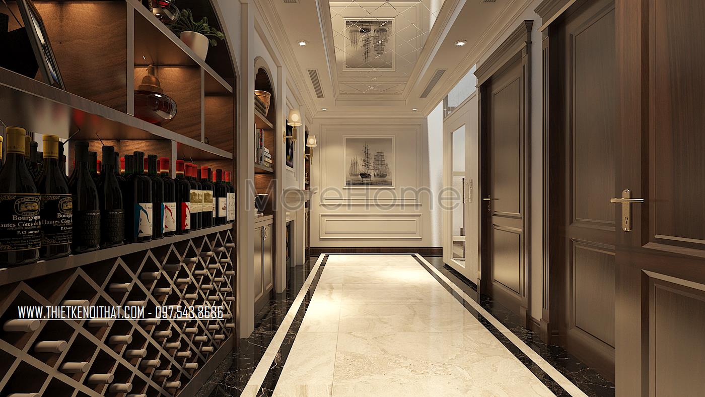 Bên ngoài hành lang đi vào phòng rượu lạ hệ thống kệ rượu âm tường cao cấp được trưng bày rất nhiều loại rượu.
