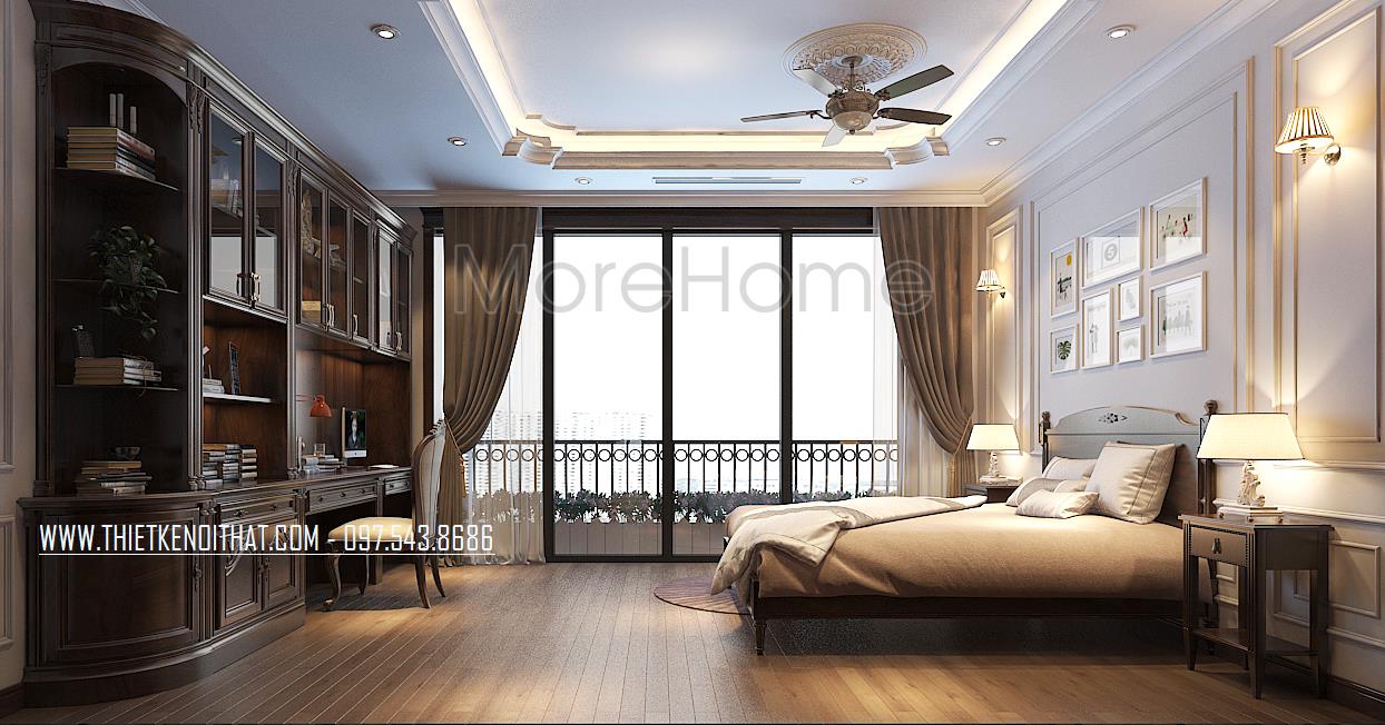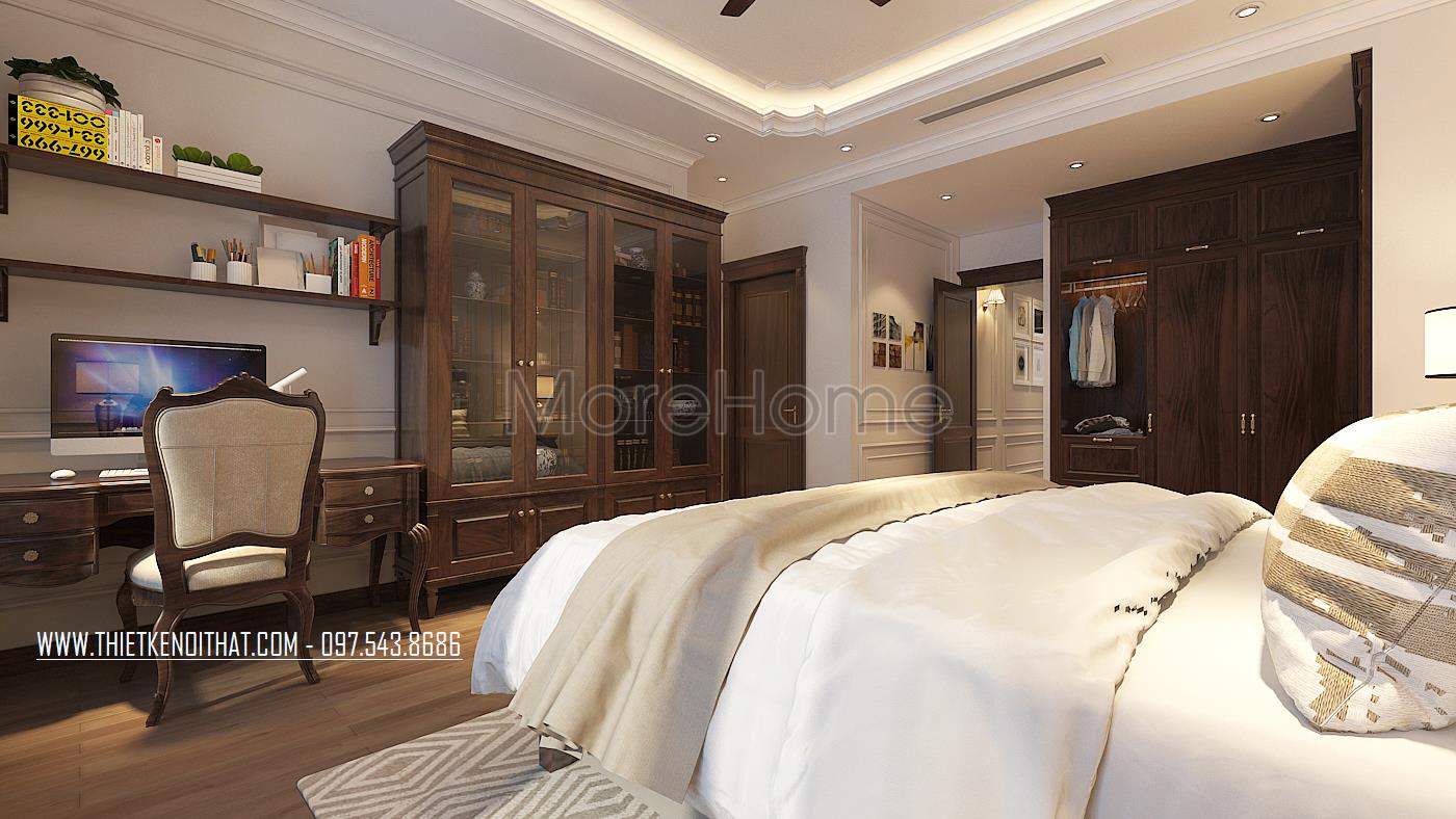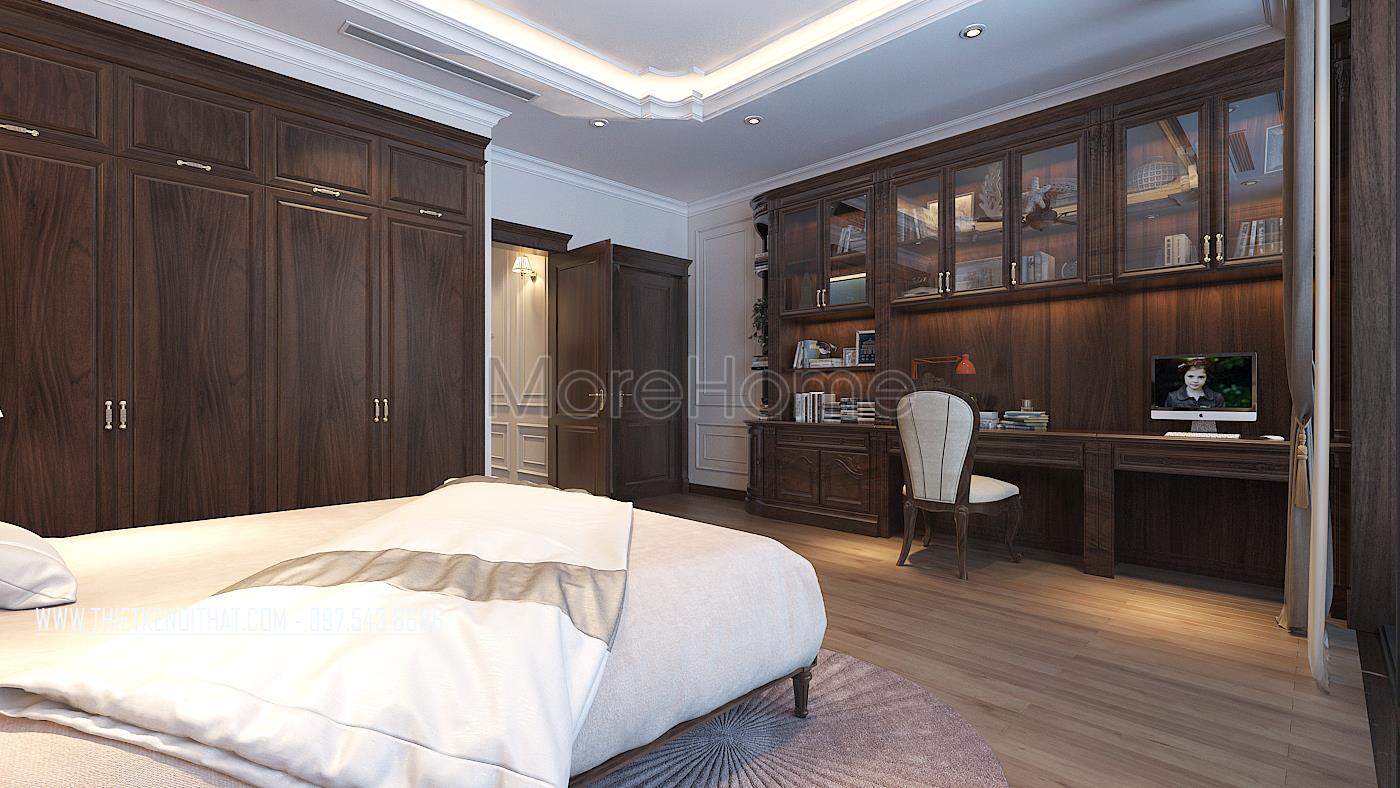 Tầng 2 căn biệt thự là không gian nghỉ ngơi của gia chủ. Phòng ngủ được thiết kế khá hiện đại và tiện nghi với đồ nội thất bằng gỗ. chiếc giường gỗ đơn giản với gỗ tự nhiên tạo sự chắc chắn an toàn khi ngủ. Hệ tủ sách và bàn làm việc được thiết kế kéo dài tạo sự tiện nghi cho gia chủ. Tủ áo được thiết kế với hệ của mở thật chắc chắn và đa năng.