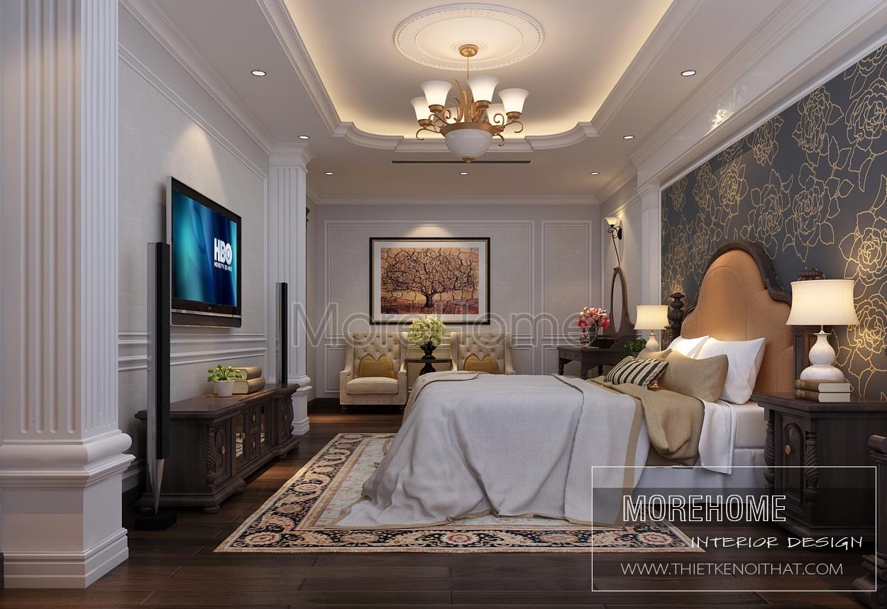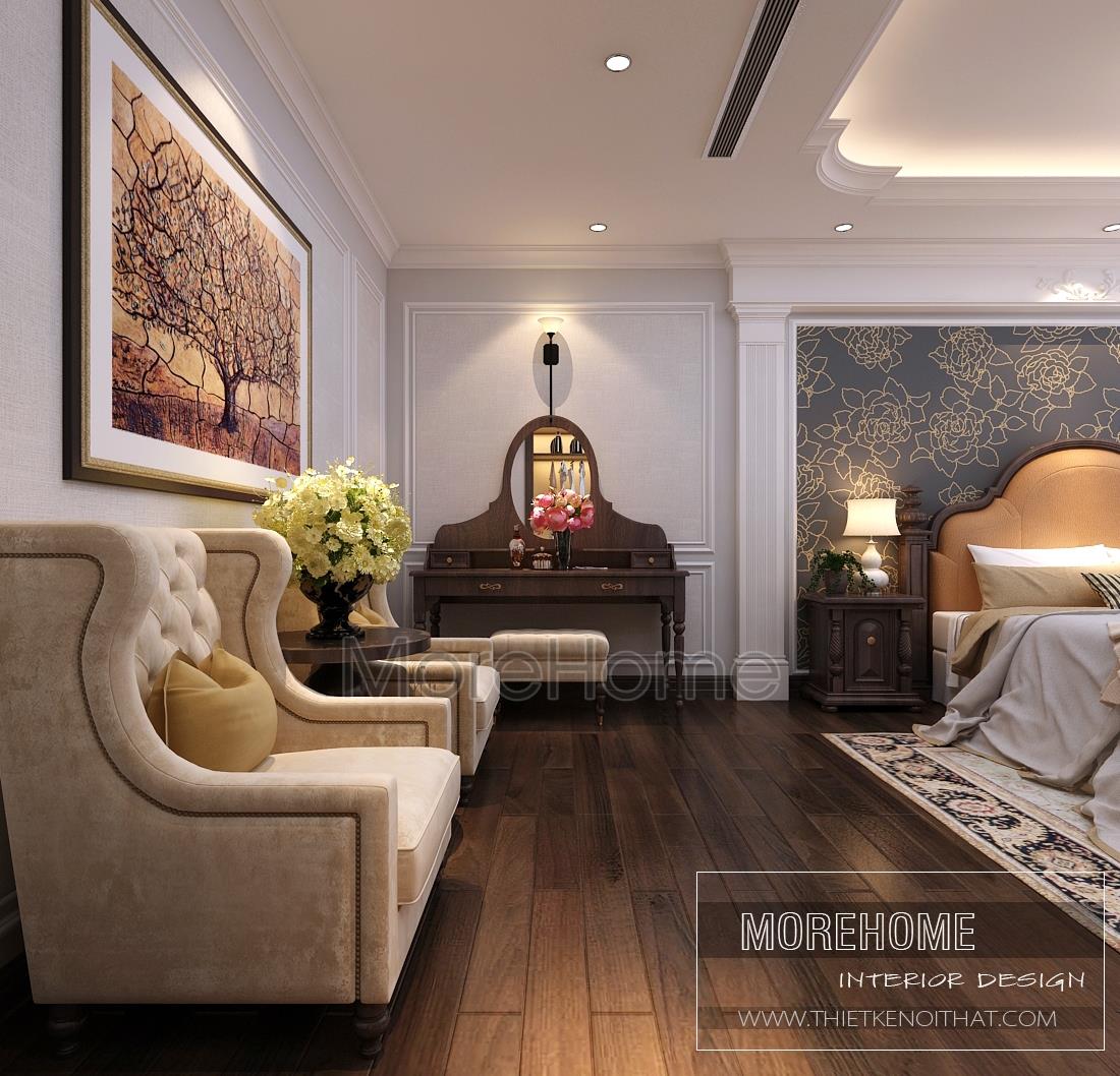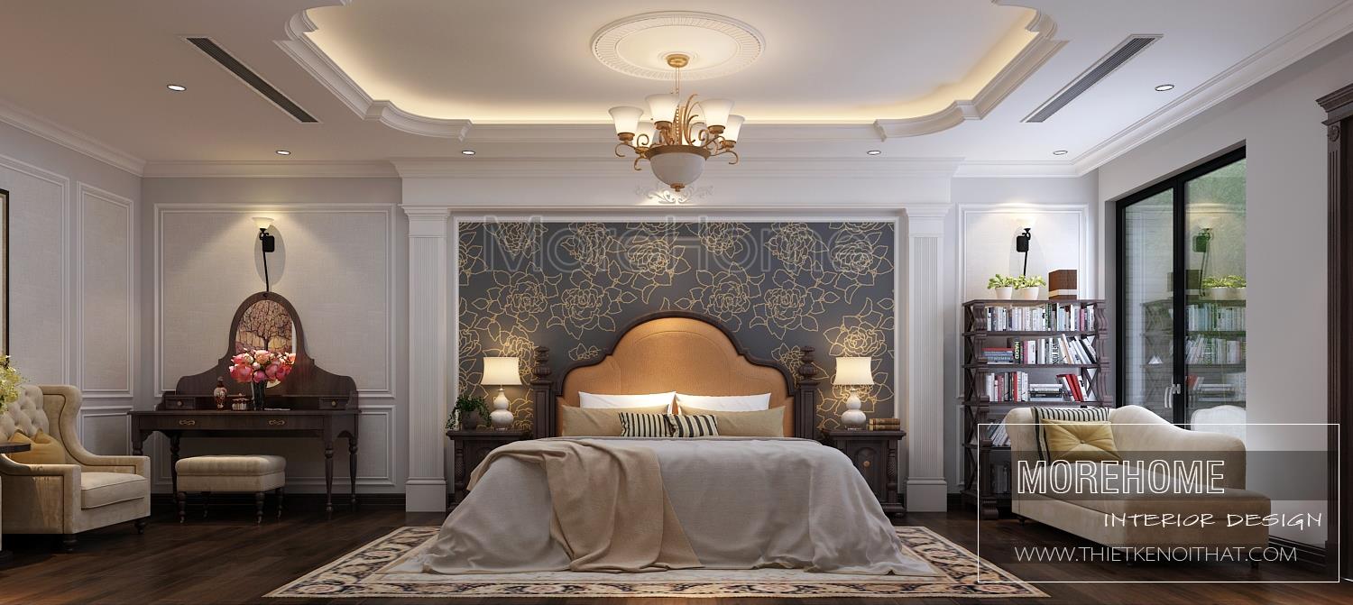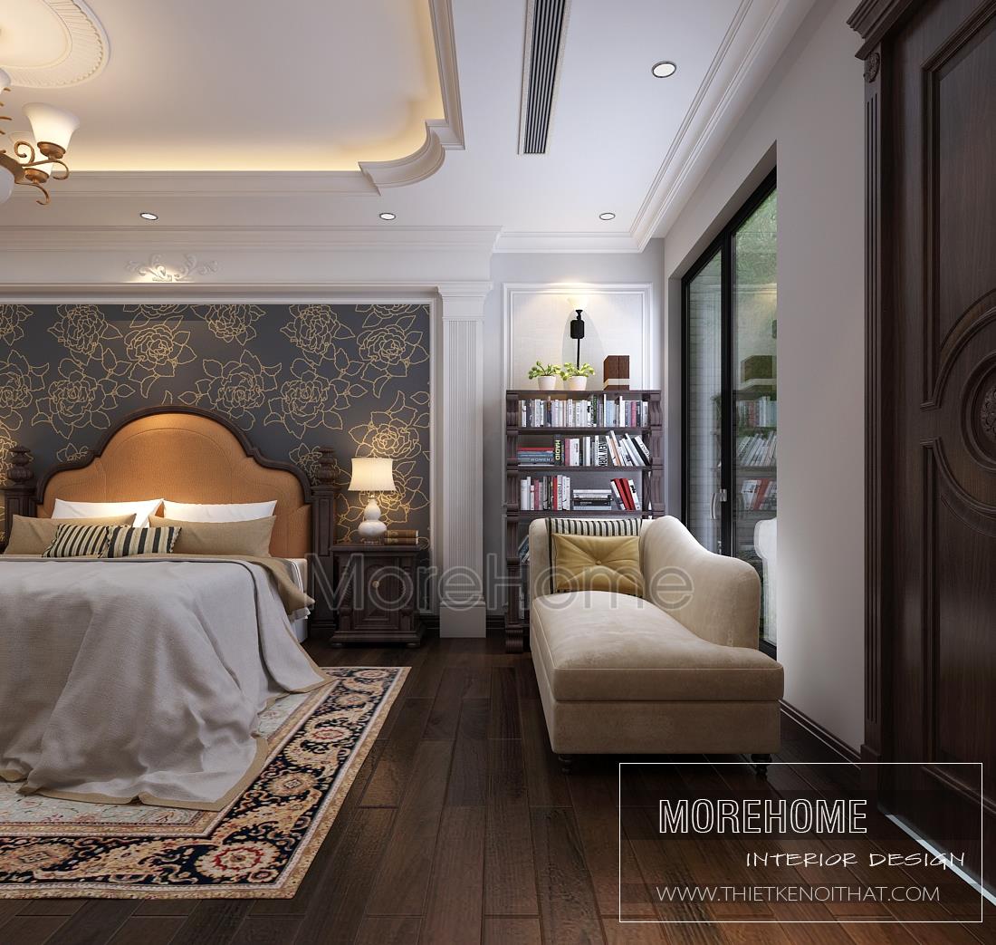 Thiết kế nội thất phòng ngủ tân cổ điển, theo phong cách của ngôi nhà phòng ngủ được thiết kế một cách lộng lẫy, tráng lệ với chiếc giường tân cổ điển, đầu giường được bọc sofa cao cấp. Hai bên giường được đặt các mẫu đồ nội thất như bàn trang điểm, đôn sofa, sofa giường, kệ sách thật tiện nghi cho việc nghỉ ngơi thư giãn, yên tĩnh của gia chủ.