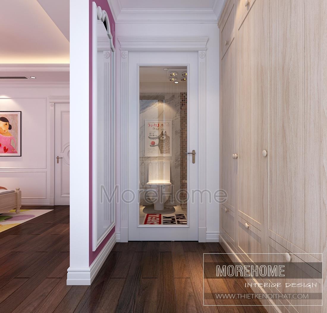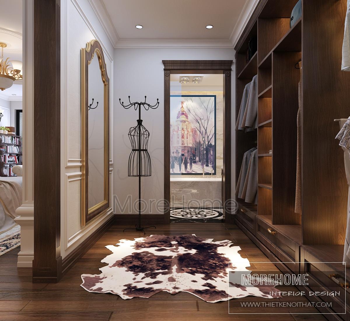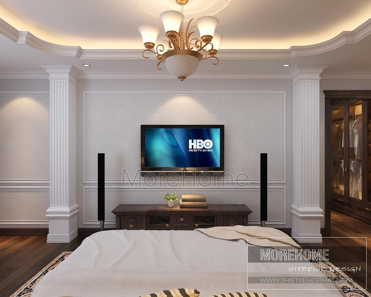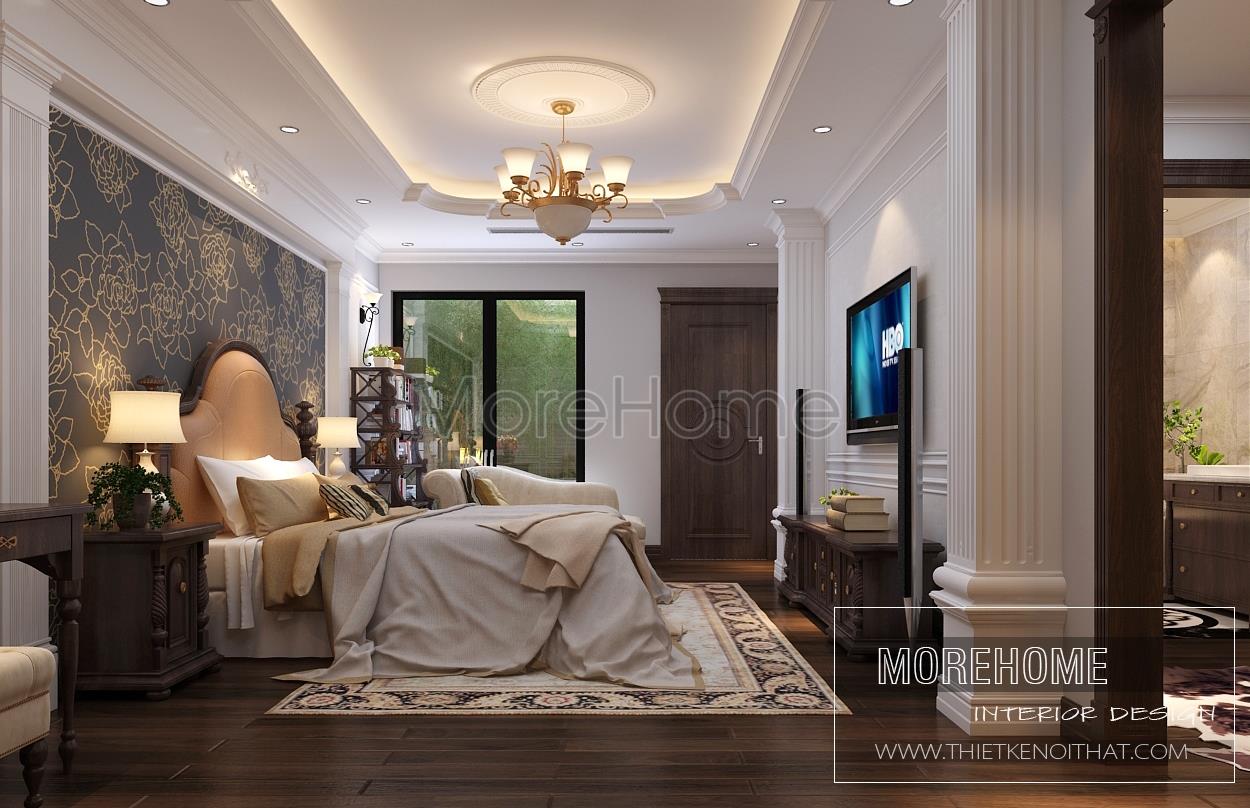 Thiết kế nội thất phòng ngủ tân cổ điển, theo phong cách của ngôi nhà phòng ngủ được thiết kế một cách lộng lẫy, tráng lệ với chiếc giường tân cổ điển, đầu giường được bọc sofa cao cấp. Hai bên giường được đặt các mẫu đồ nội thất như bàn trang điểm, đôn sofa, sofa giường, kệ sách thật tiện nghi cho việc nghỉ ngơi thư giãn, yên tĩnh của gia chủ.