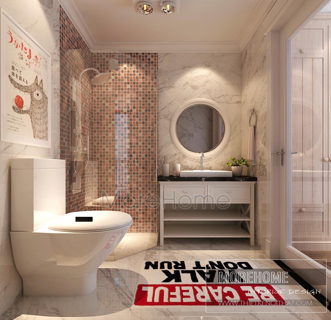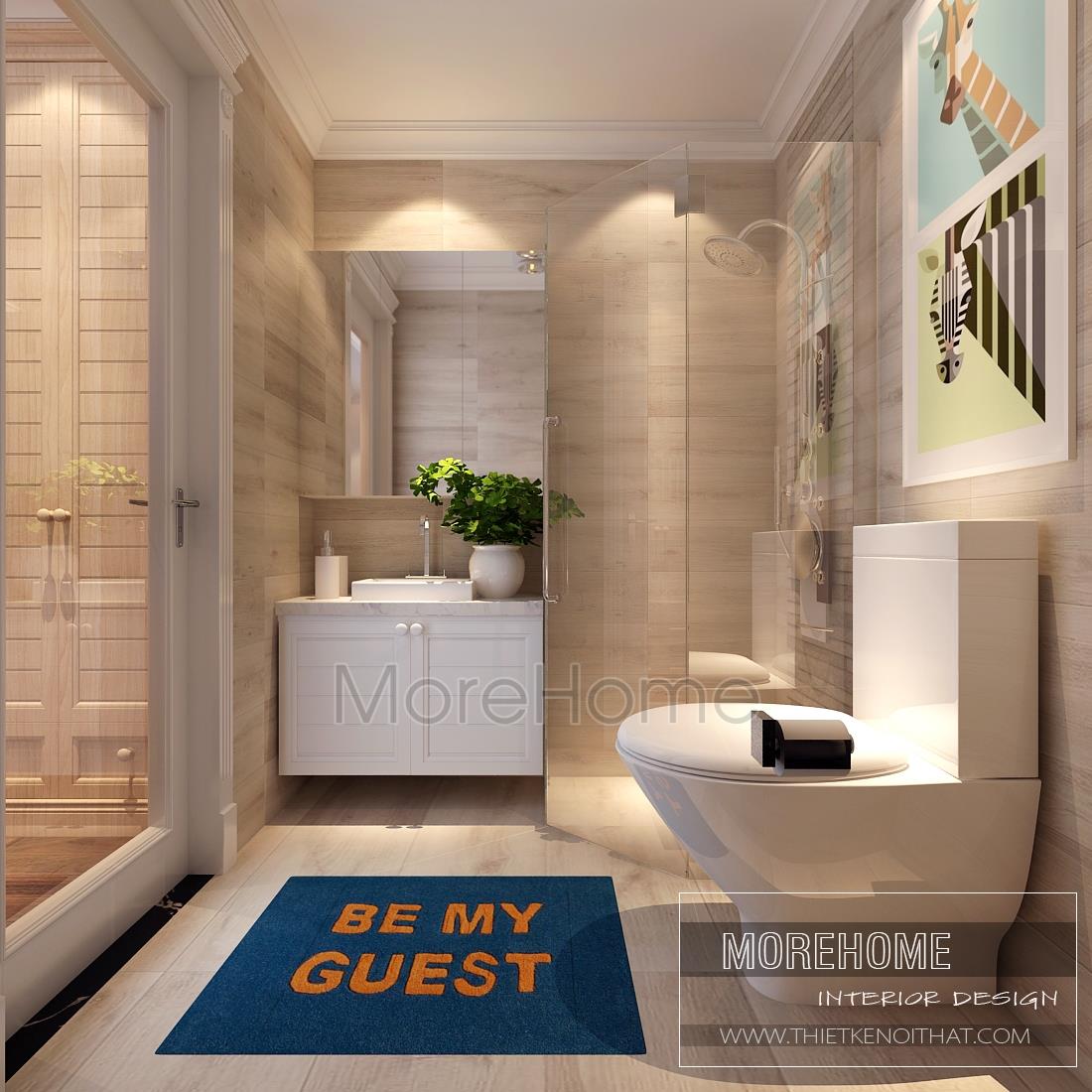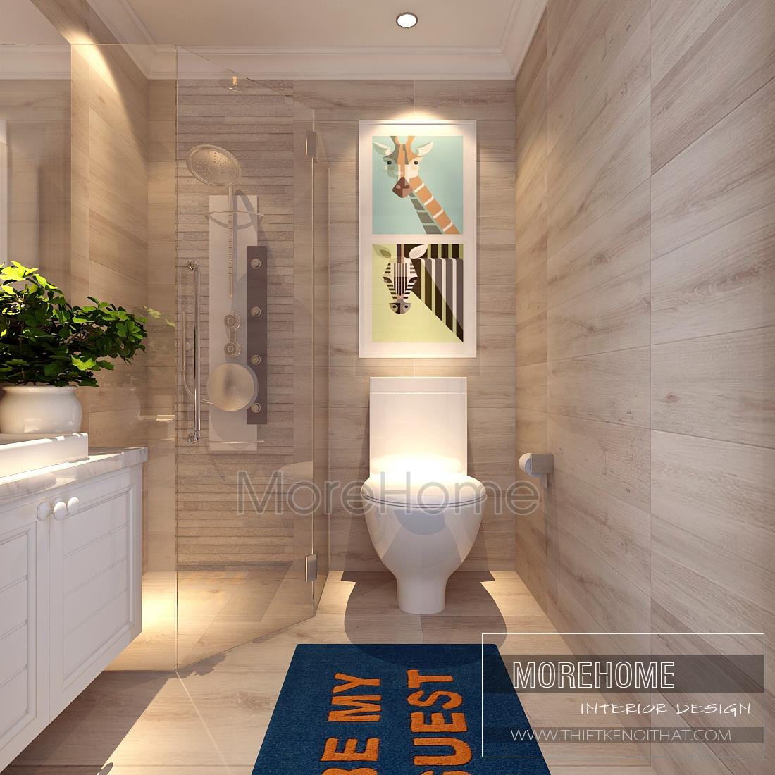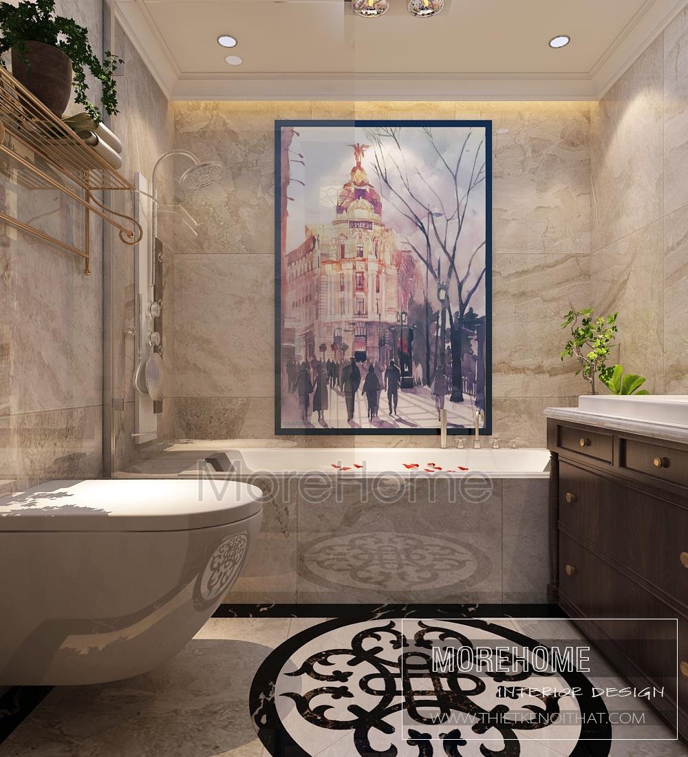Cũng trong không gian này phòng tắm được thiết kế tinh tế với chiếc bồn tắm được ngăn bởi vách tắm kính tạo sự phân cách tuyệt vời cho không gian tắm và vệ sinh.