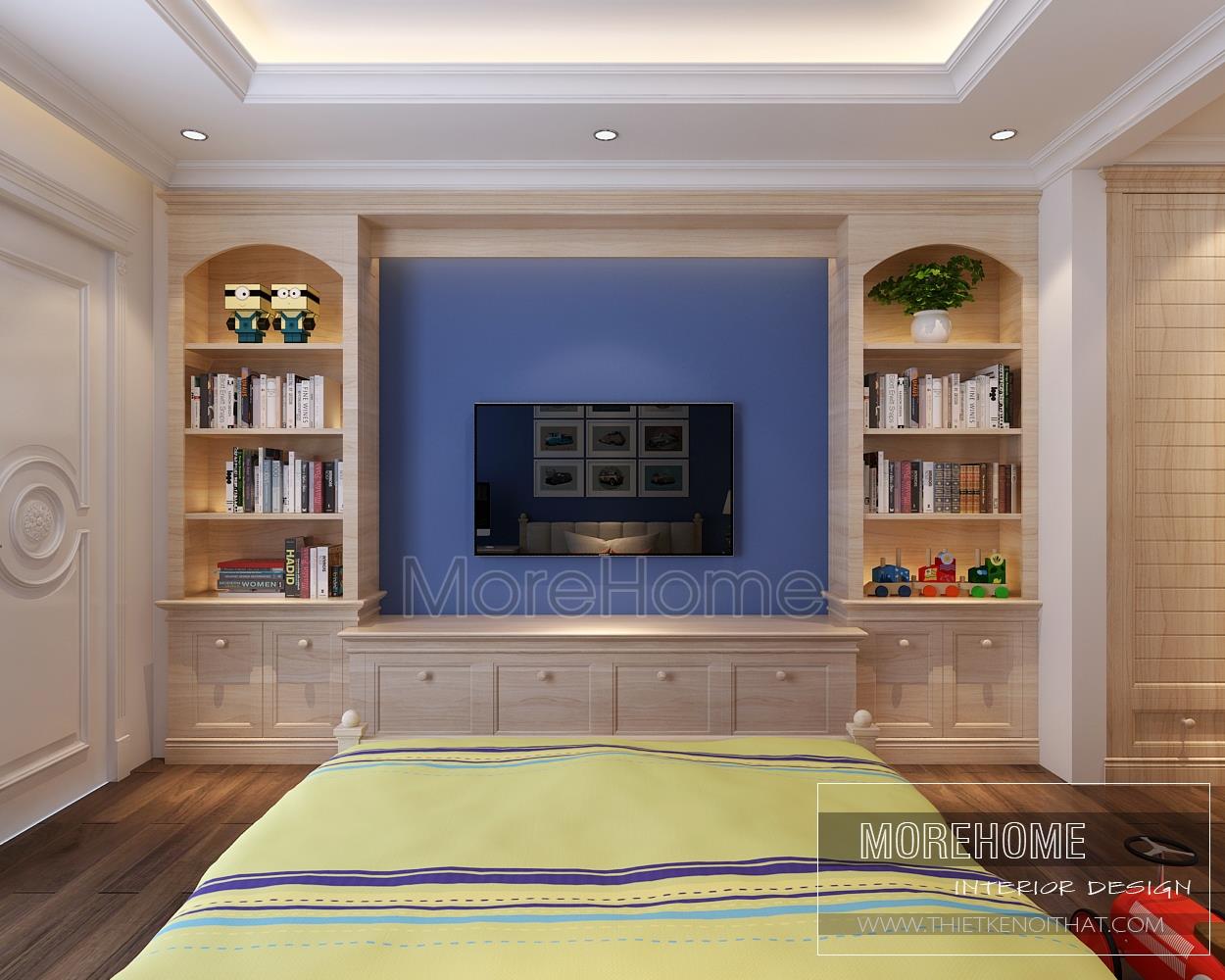 Thiết kế phòng ngủ bé trai năng động, sáng tạo hơn với màu xanh và họa tiết trang trí. Phòng ngủ bé trai luôn có hệ thống kệ sách lớn vì con trai luôn có những lý tưởng sống rộng hơn con gái.