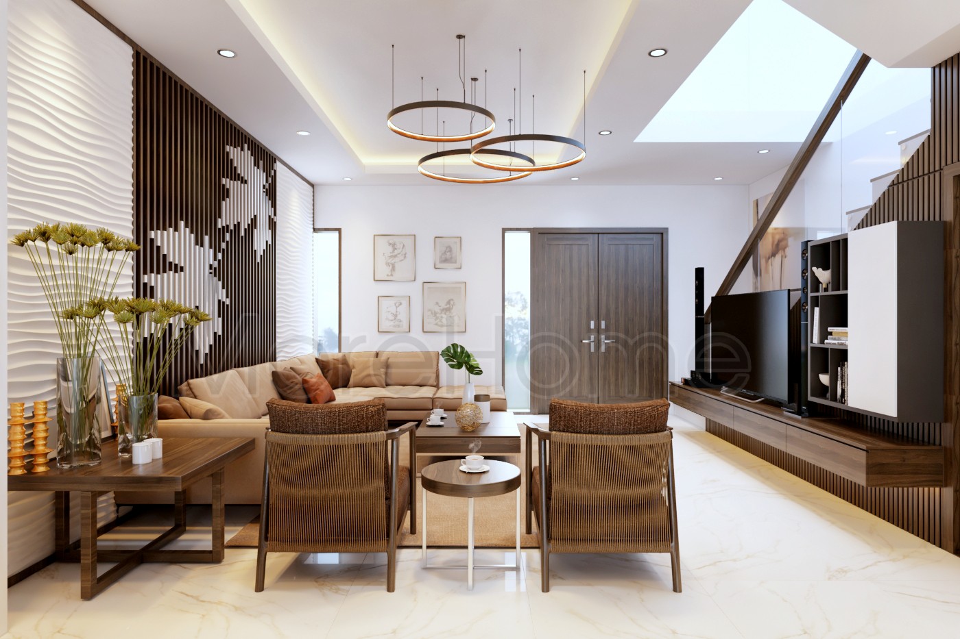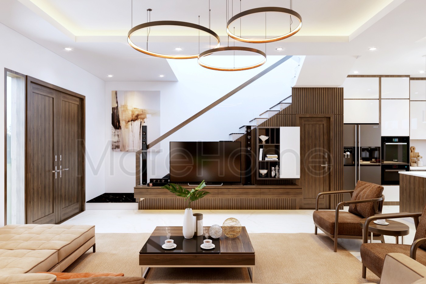 Không gian phòng khách được thiết kế nội thất cao cấp. Bộ sofa da chữ L cao cấp màu nâu tạo sự sang cảnh cho căn phòng. Chiếc bàn trà gỗ tự nhiên đơn giản mà tinh tế, chiếc đèn trần được dùng ở đây được thiết kế khá sáng tạo với 3 hình tròn lớn đan sen nhau. Mảng tường ốp gỗ sọc dọc xen kẽ tạo nên hình chiếc là bắt mắt.
