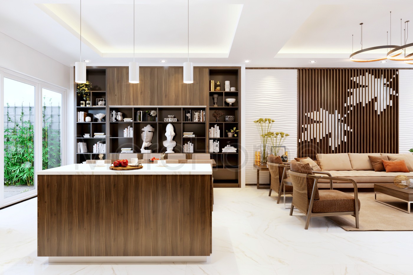Không gian phòng bếp được thiết kế khá linh động, mẫu tủ bếp được làm bằng gỗ công nghiệp An Cường và gỗ Veneer óc chó tạo sự thân thiện cho bà nội trợ. Phòng bếp được thiết kế giúp bạn nhìn vào sẽ thấy được sự sạch sẽ, gọn gàng và tiện nghi. Chiếc bàn đảo được đặt trong không gian này nhằm tạo sự ngăn cách hợp lý với bộ bàn ăn và không gian nấu nước, 2 chiếc ghế bar được sử dụng nhằm đẩy mạnh điểm nhấn cho khu vực bếp.