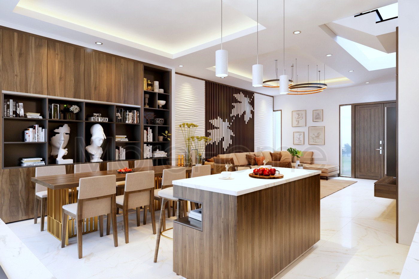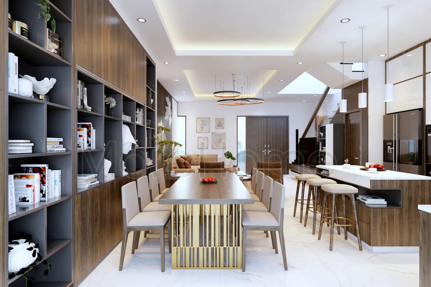 Bên cạnh phòng khách là mảng tường kéo dài liên thông phòng ăn và bếp không bị bỏ trống bởi KTS đã thiết kế hệ thống kệ tủ trang trí với nhiều ngăn khác nhau giúp cho không gian phòng ăn không còn trống trải. Bộ bàn ăn được thiết kế hiện đại với chiếc bàn được làm từ gỗ veneer óc chó cao cấp, 8 chiếc ghế được bọc vải tạo cảm giác êm ái, thoải mái khi ngồi.