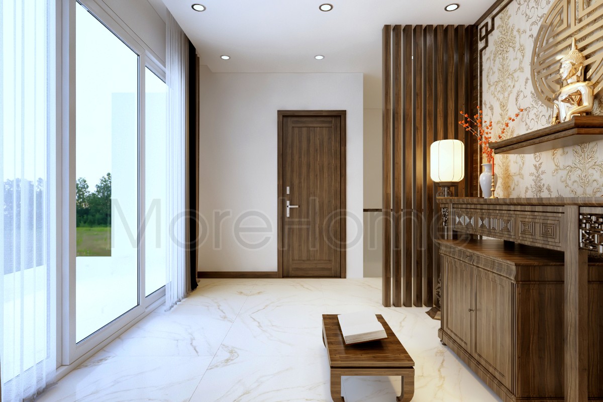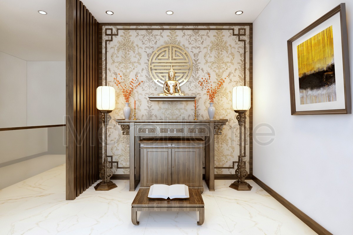 Bạn sẽ ưng ý hơn khi bước vào không gian phòng thờ, nơi thanh tịnh nhất của căn nhà. Phòng thờ được thiết kế với mẫu tủ thờ phật hiện đại, phía sau tủ thờ được sử dụng mẫu giấy dán tường họa tiết cổ điển nhằm tôn lên vẻ tôn nghiêm của không gian thờ cúng. Vách ngăn gỗ tự nhiên được sử dụng nhằm ngăn cách lối đi tiện nghi.