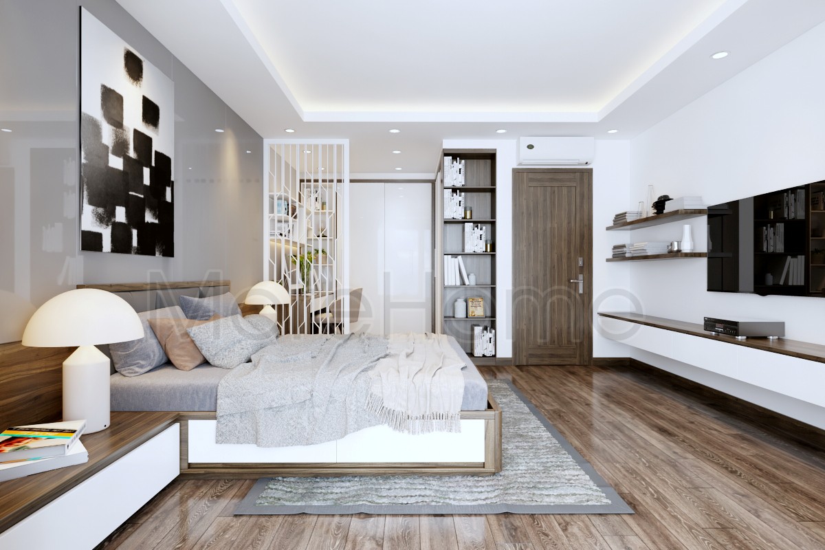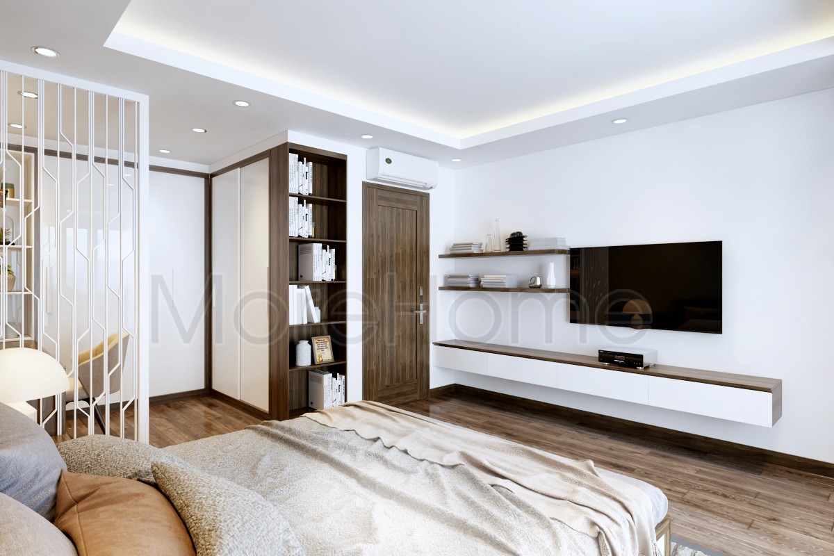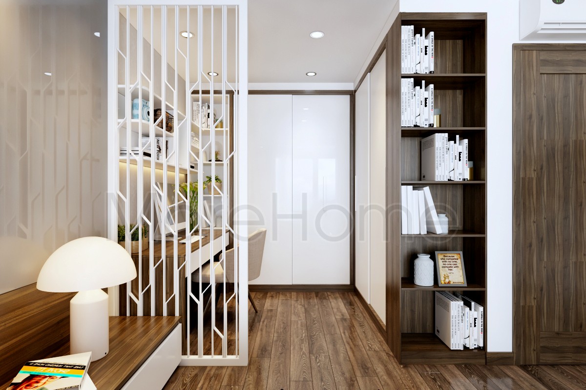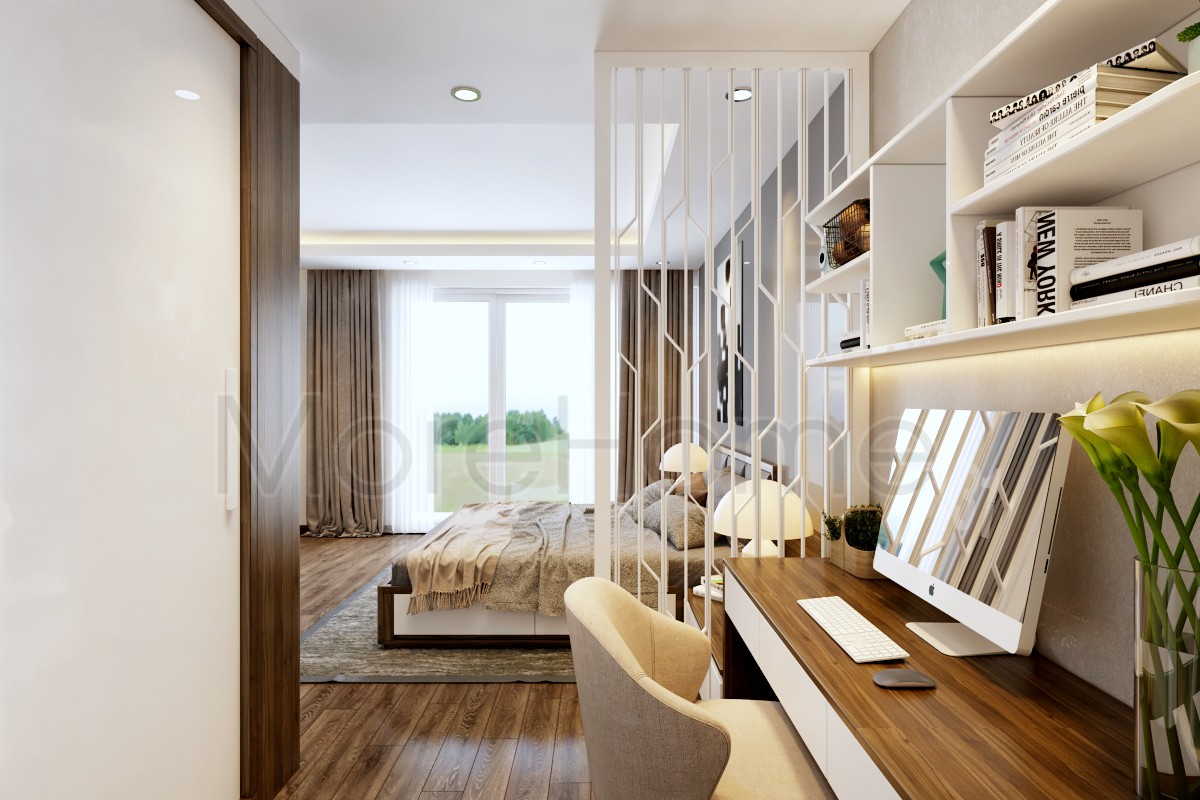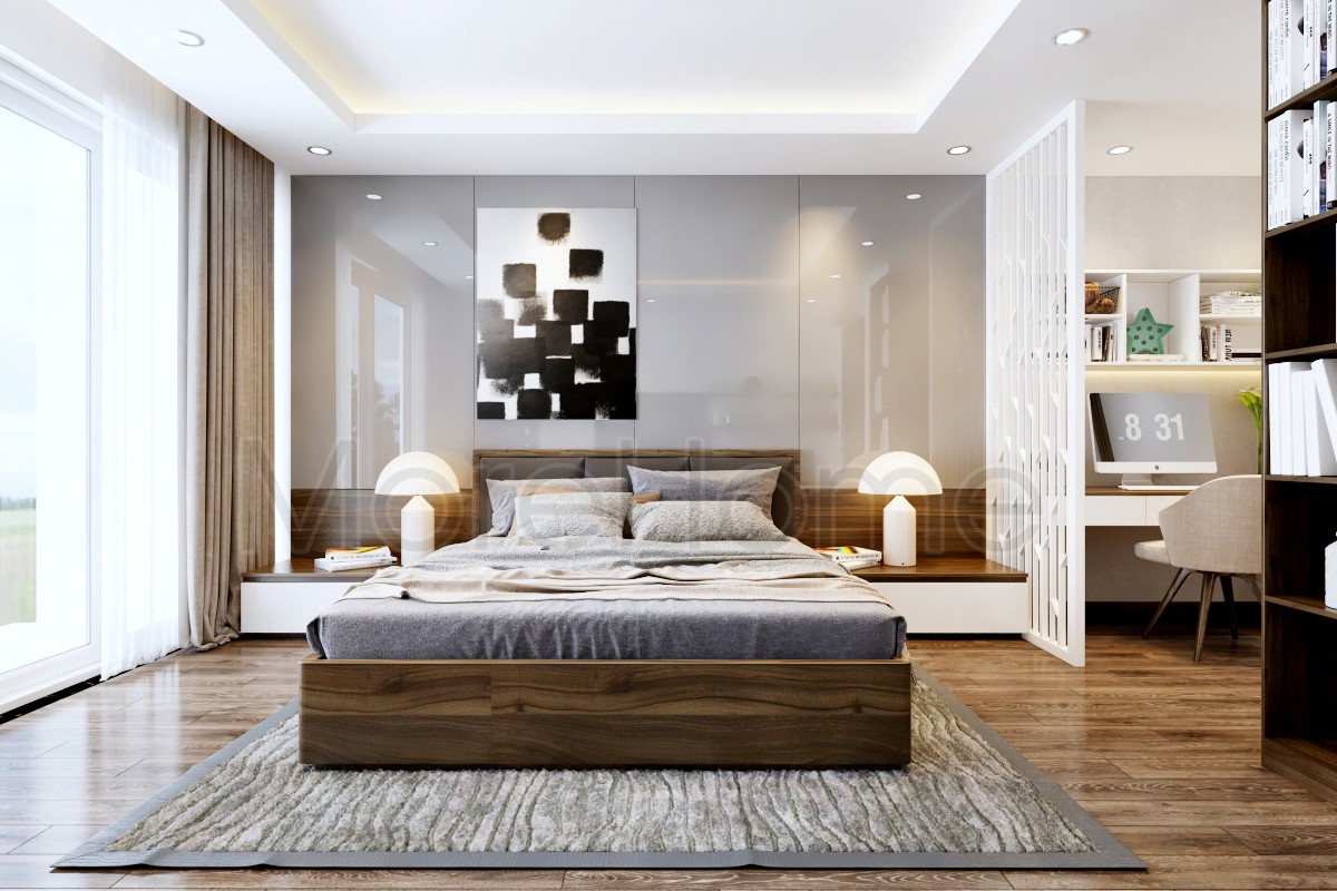 Thiết kế nội thất phòng ngủ hiện đại, sang chảnh với mảng tường ốp kính cường lực. Rất ít gia chủ lựa chọn kính cường lực ốp trong không gian phòng khách nhưng chủ nhân căn phòng này lại táo bạo sử dụng tạo cho không gian nhà thêm mới lạ. Phòng ngủ được thiết kế ngăn cách các hoạt động trong phòng. Bàn làm việc được ngăn cách bởi vách ngăn cnc màu trắng tạo sự tiện nghi riêng biệt. Kệ sách được thiết kế âm tường ngay bên cạnh cửa ra vào giúp tiết kiệm không gian.