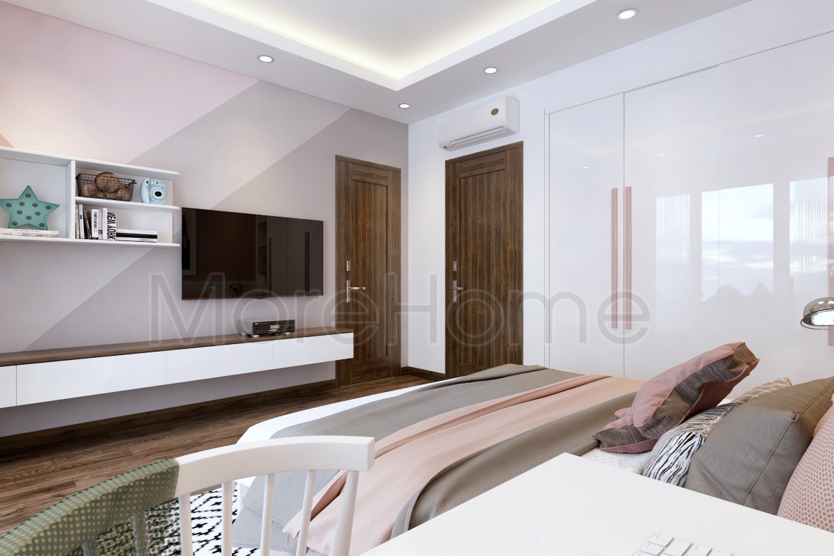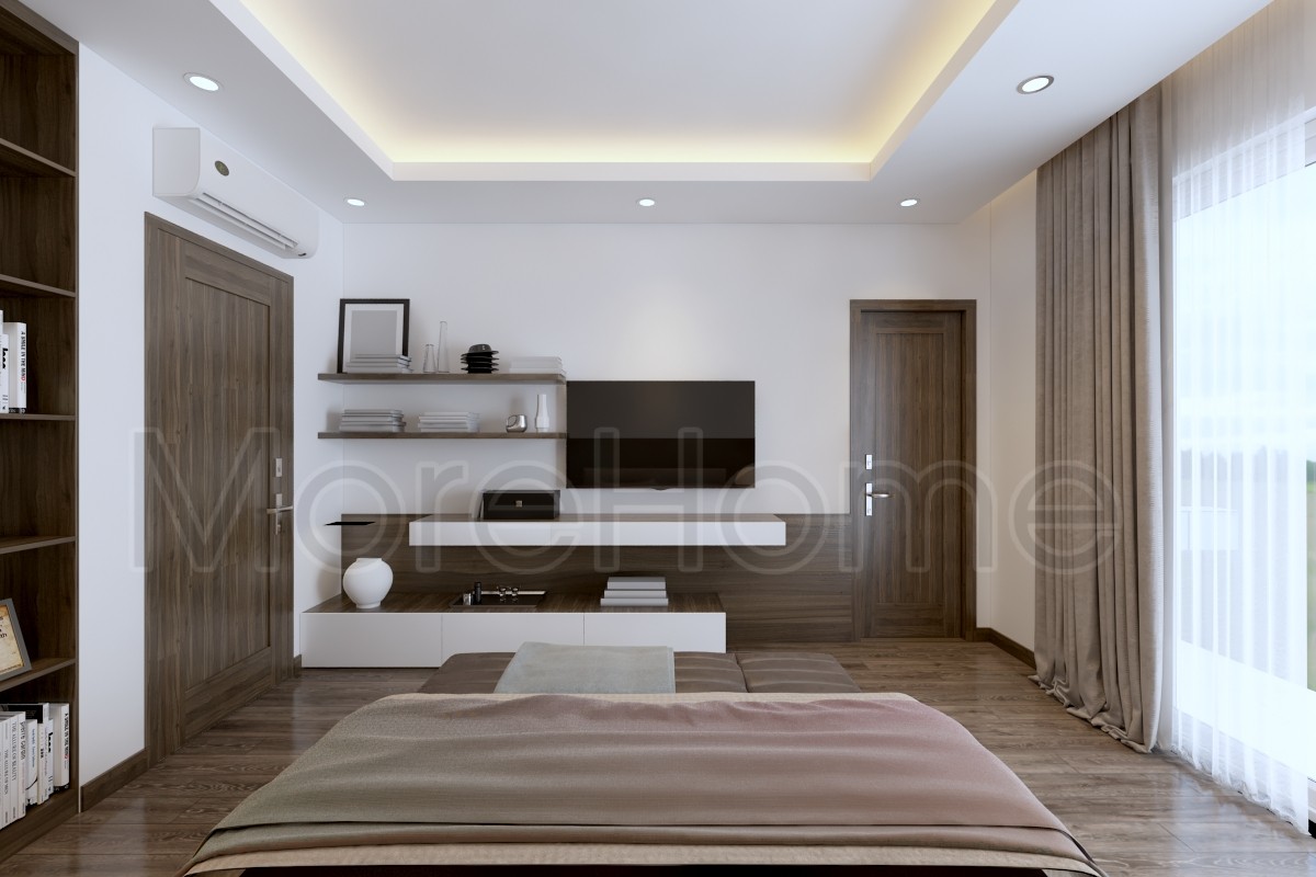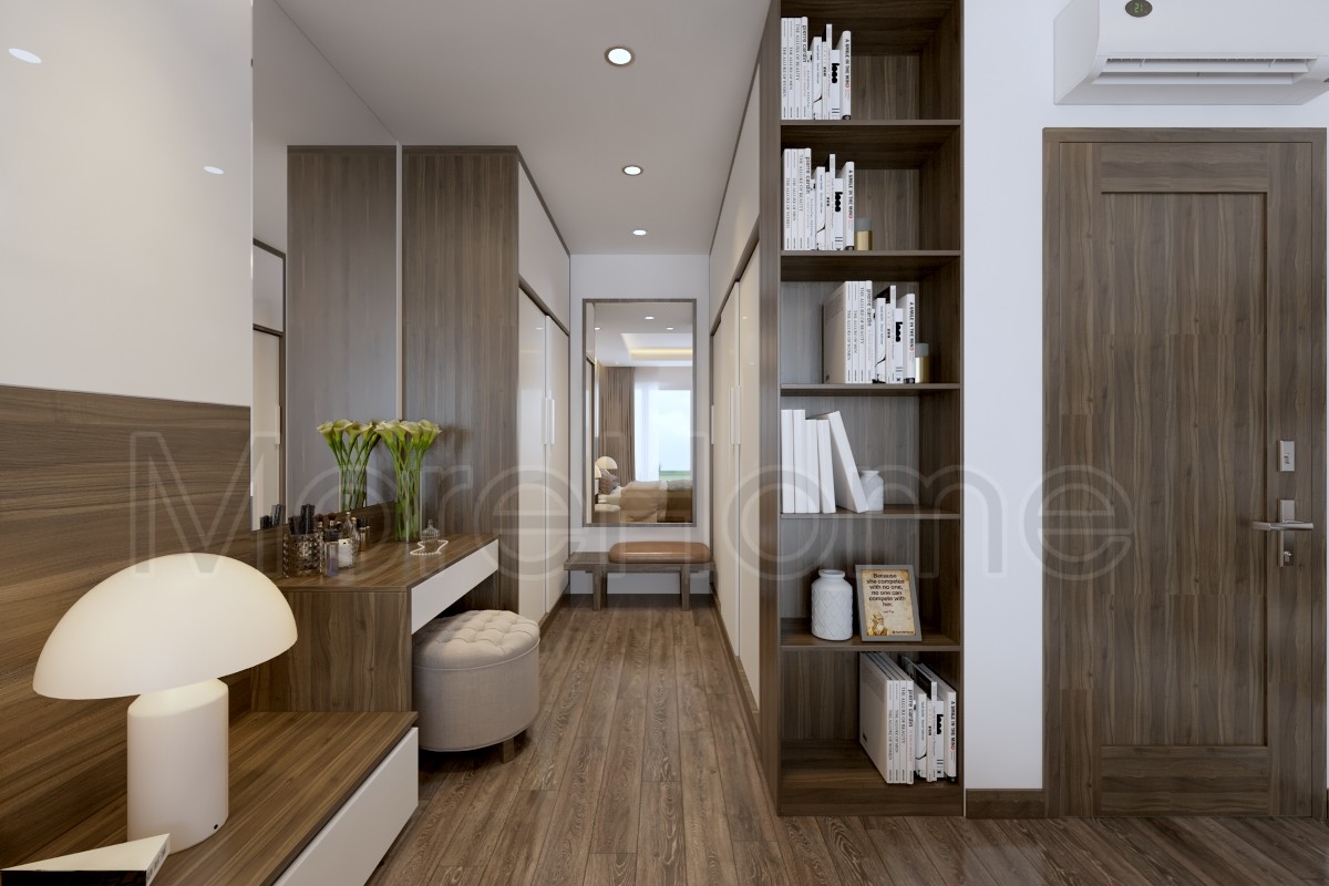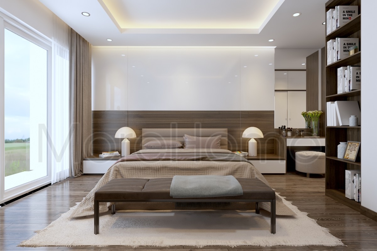 Thiết kế phòng ngủ 2 đầy tiện nghi, mẫu giường gỗ tự nhiên được áp dụng trong không gian này. Bàn trang điểm được thiết kế tối giản kết hợp chiếc gương dài ốp vào tường đúng với phong cách hiện đại. Những chiếc kệ sách được thiết kế âm tường, gọn gàng và tiện nghi, sử dụng chất liệu gỗ công nghiệp nhẹ nhàng.