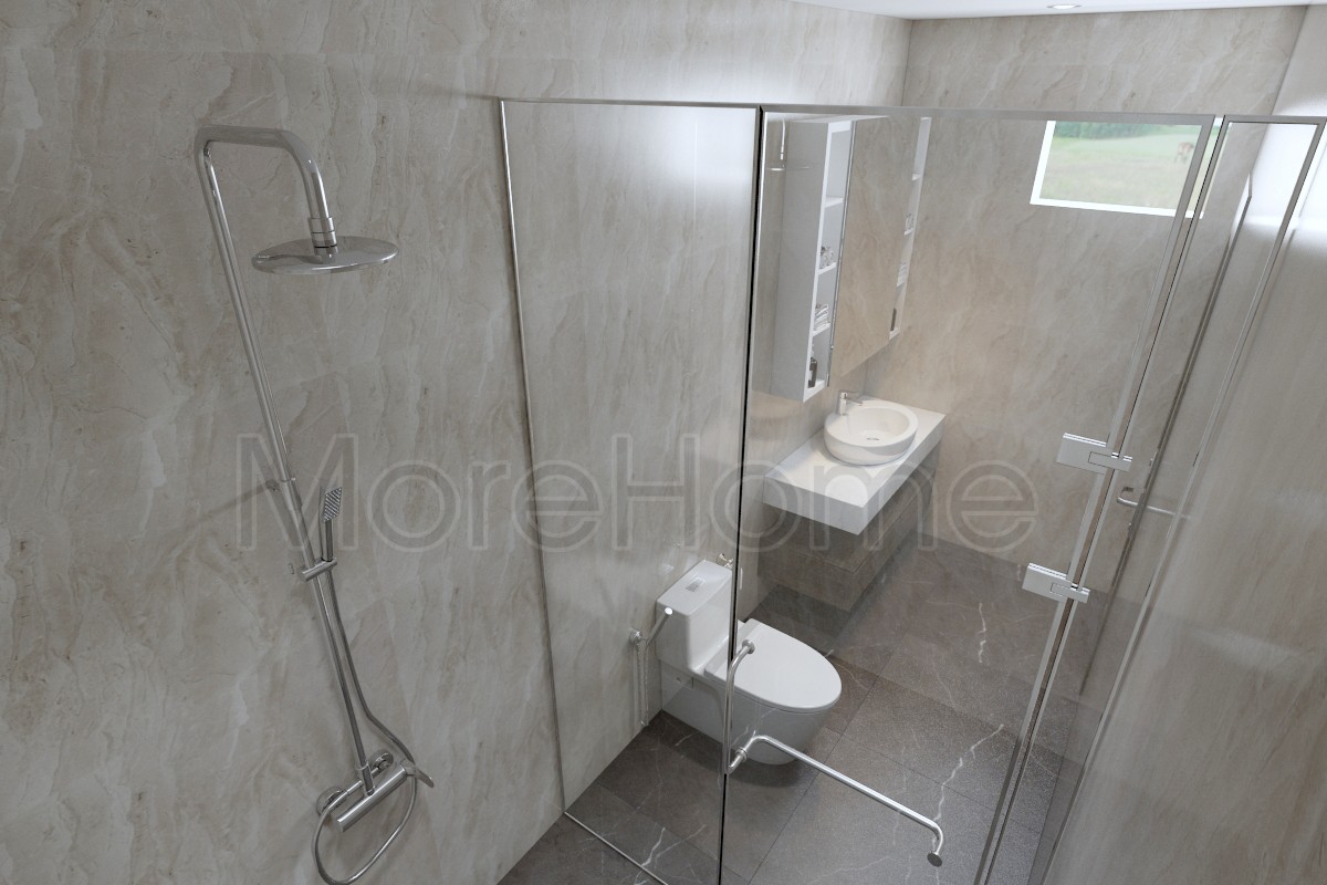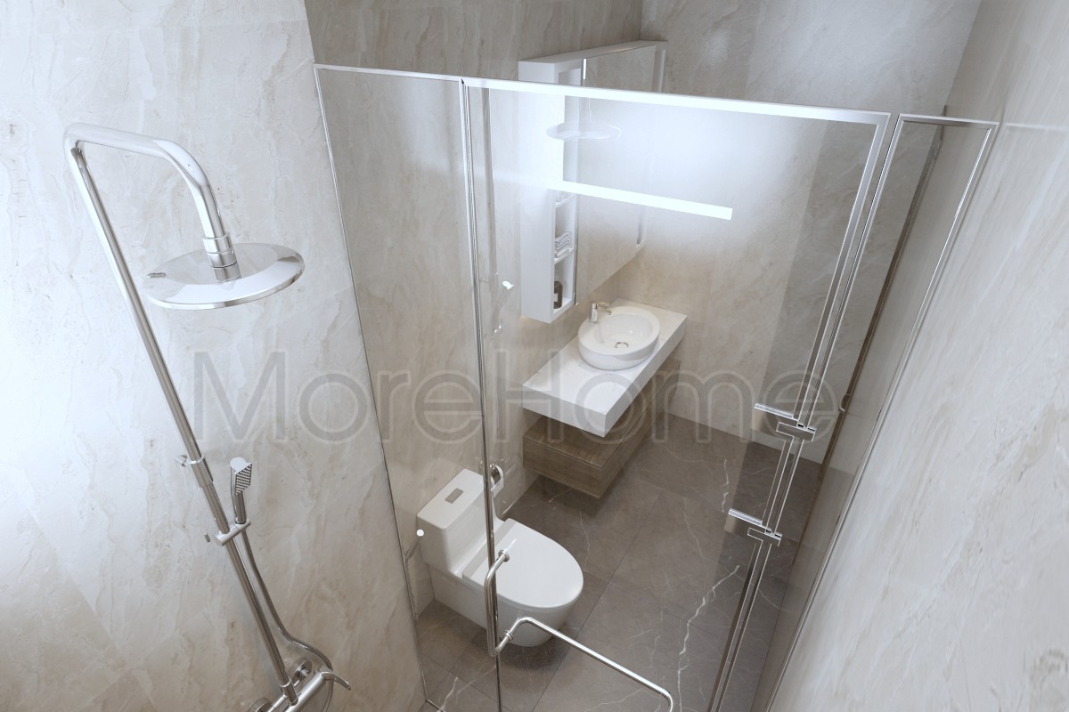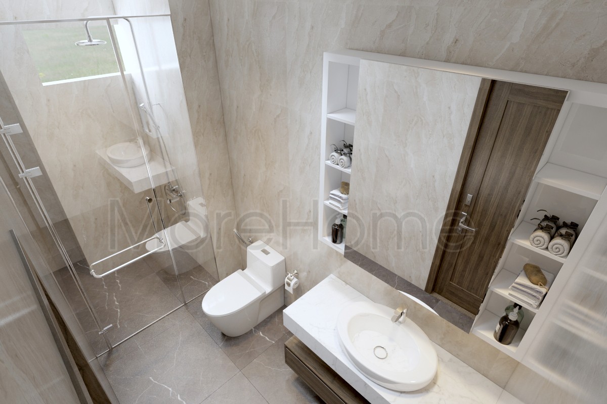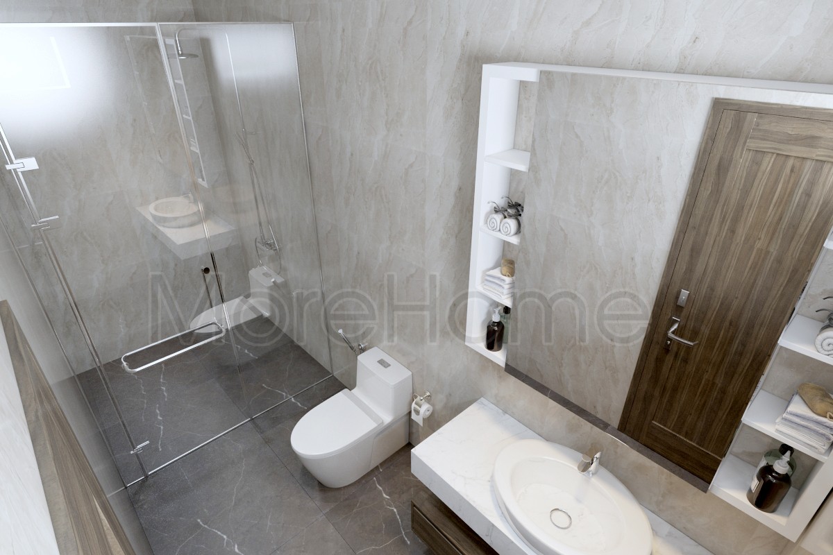 Thiết kế phòng tắm hiện đại, với gam màu cửa gạch ốp tường, bên cạnh đó là sự trắng toát của thiết bị vệ sinh giúp cho không gian phòng thêm tinh tế. Chiếc cửa gỗ màu trầm tạo sự nổi bật nhất định trong một không gian trắng toát.