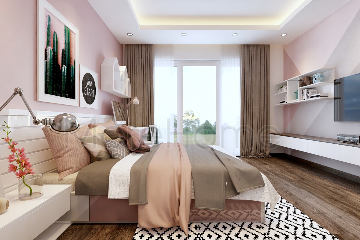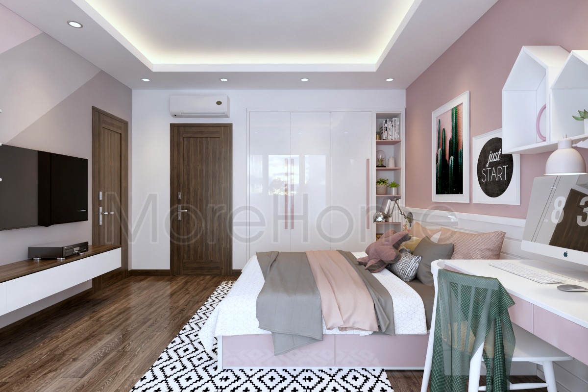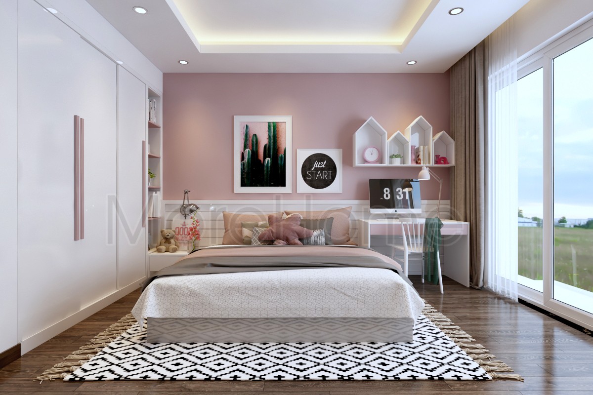 Thiết kế phòng ngủ bé gái cute đáng yêu với gam màu hồng. Nền tường được sơn màu hồng tạo sự đáng yêu cho bé, những chiếc kệ sách hình ngôi nhà ngộ ngĩnh cùng với chiếc bàn học đơn giản giúp bé yêu không gian góc học tập của mình hơn. Tủ áo được thiết kế theo kiểu tủ kéo tạo sự tiện nghi nhất định cho bé. Đặc biệt chiếc thảm trải sàn hình ô vuông đen trắng cũng làm nổi bật căn phòng xinh xắn này.