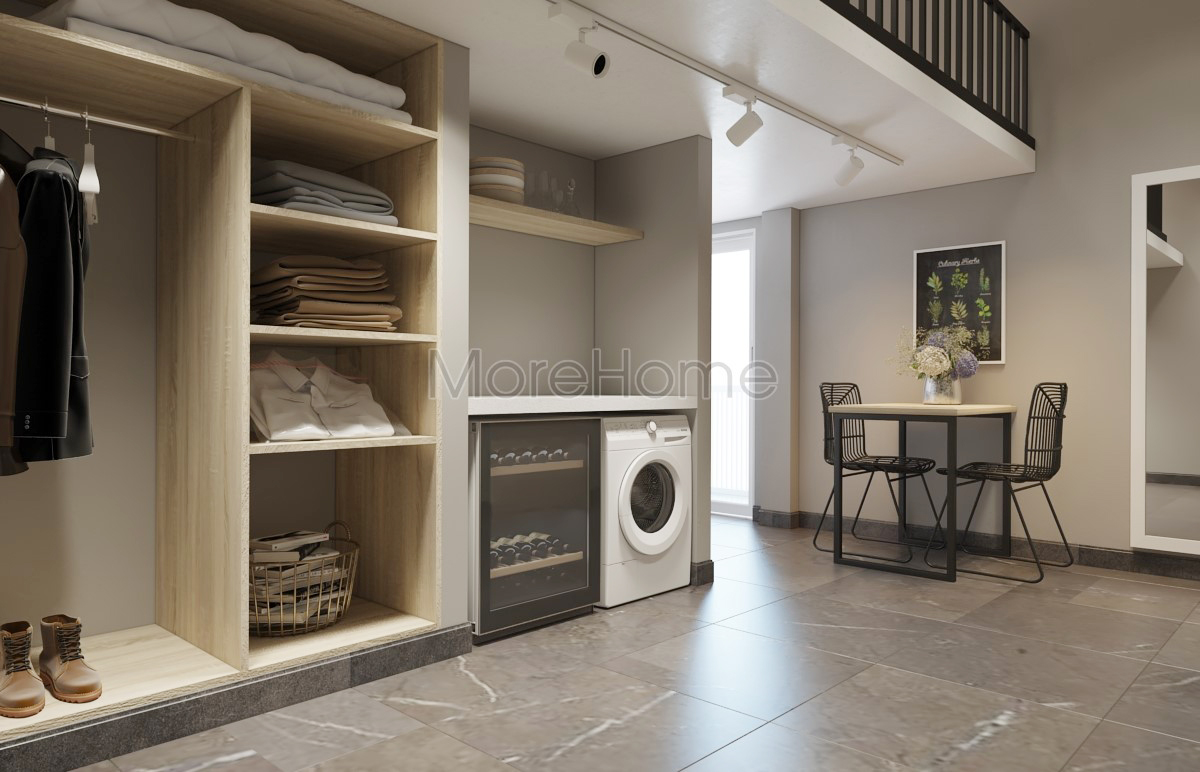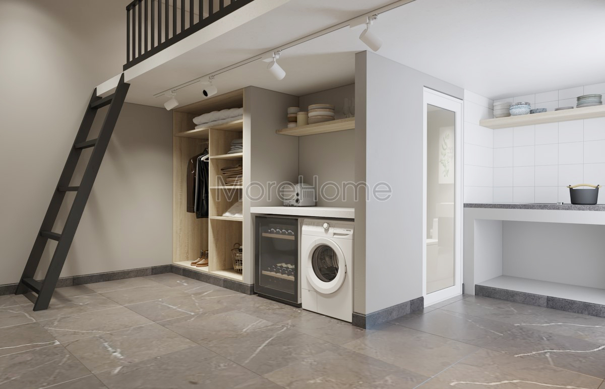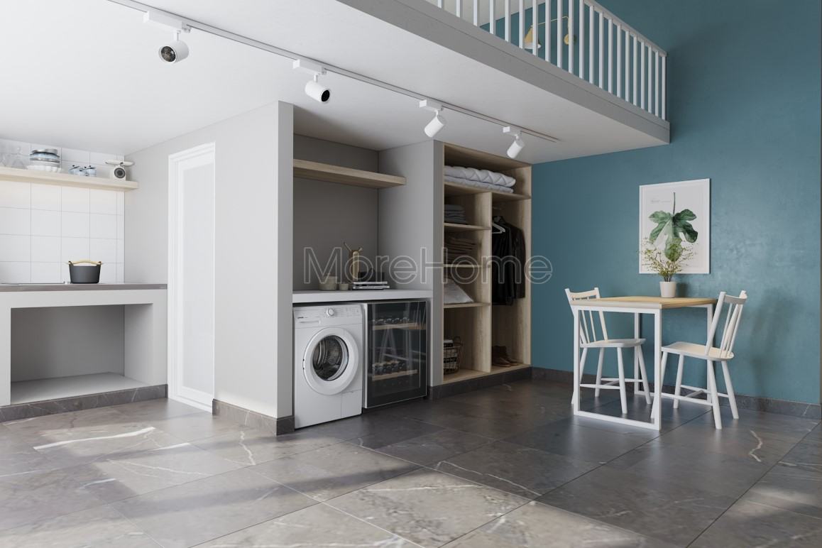 Bước lên tầng 2 không gian đầu tiên đập vào mắt bạn là không gian giặt giũ, nhà vệ sinh hiện đại. Hệ thống máy giặt, tủ đồ được đặt gần nhau ngay mảng tường của không gian phòng tắm, phòng vệ sinh.