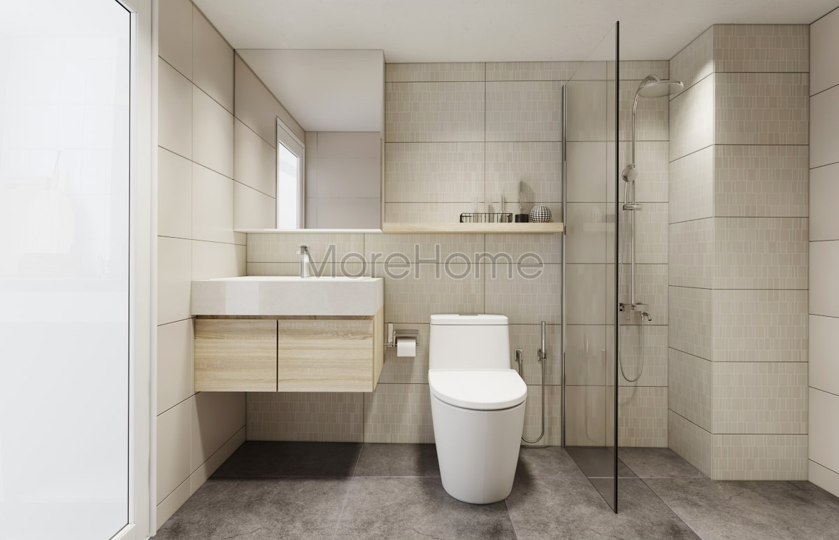 Nội thất phòng tắm cũng cực kì đơn giản với mảng tường màu xám lông chuột. Không gian vệ sinh cũng được tách biệt bởi vách tắm kính cường lực, bồn rửa mặt và gương phòng tắm cực kì đơn giản với thiết kế hình vuông trơn mướt.