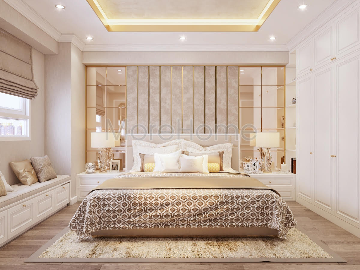 Thiết kế phòng ngủ mang phong cách tân cổ điển như những không gian khác của căn hộ. Đầu giường được ốp bằng vách nỉ cao cấp không thể thiếu những đường kẻ ngang dọc tạo nên sự mạch lạc trong phân chia không gian. Vì diện tích không quá lớn nên bàn phấn được đặt cạnh giường thay vào đó chỉ có 1 tab đầu giường được sử dụng. Gương trang điểm lớn vuông vắn nhưng vẫn rất ăn nhập với vách đầu giường. Như thường lệ, tủ quần áo vẫn là tủ kịch trần nhằm sử dụng tối đa không gian, khi ở chung cư chiều cao của trần tương đối thấp. Hệ thống chiếu sáng của căn phòng được chia thành 2 phần rõ ràng: 1 để chiếu sáng với cường độ lớn hơn và một loại là đèn hắt được sử dụng khi gia chủ không muốn có ánh sáng quá chói lóa.