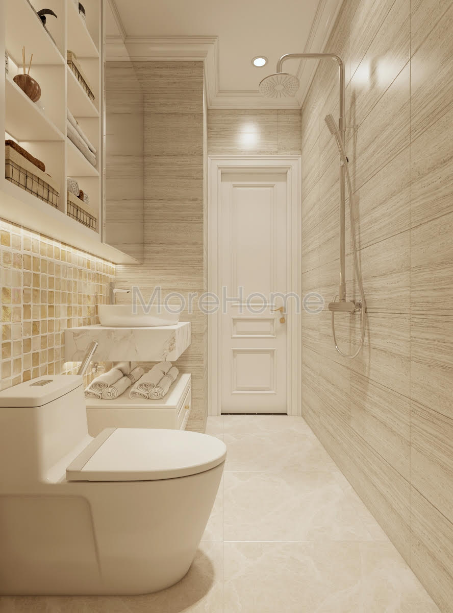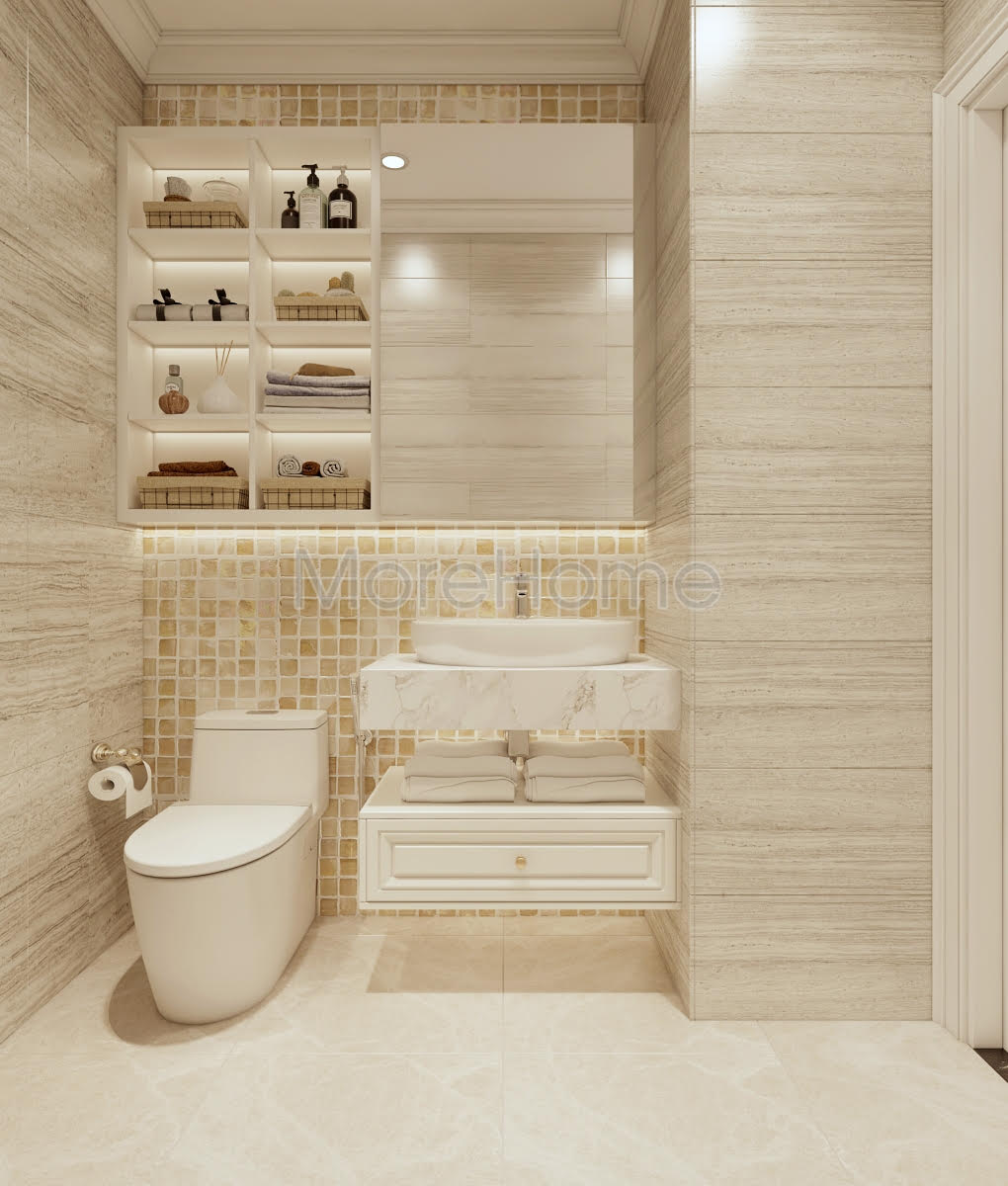 Chúng ta có thể nhận ra một điều rõ ràng là phòng vệ sinh vẫn được sử dụng phào chỉ mang đạm phong cách tân cổ điển. Chất liệu gạch ốp lát cao cấp kết hợp với đá tự nhiên, phân đá sự dụng để làm mặt lavado là đá trắng Hi Lạp với những đường vân rất tinh tế và bắt mắt đã được thợ có tay nghề cao của Morehome gia công rất kĩ lưỡng và đảm bảo.