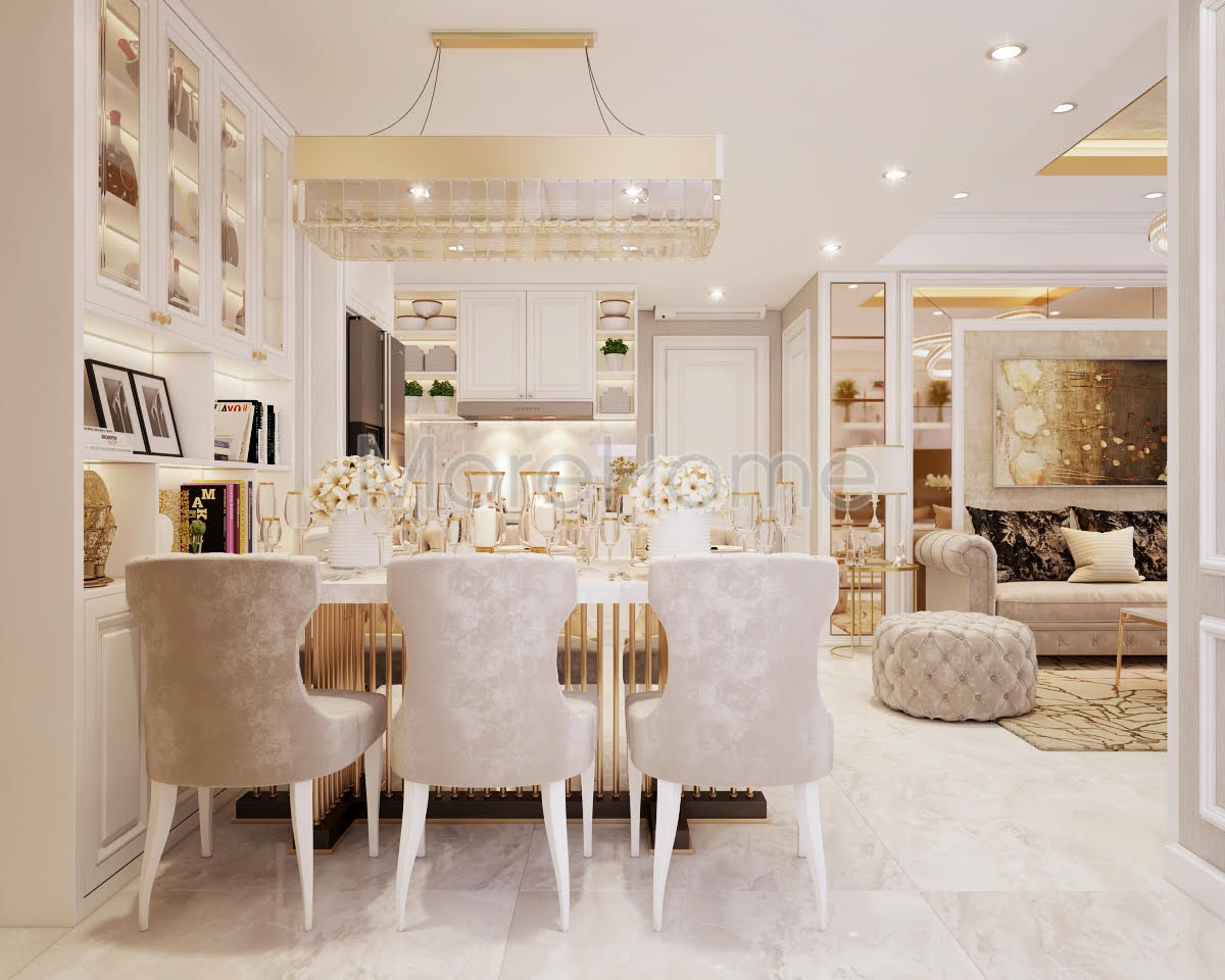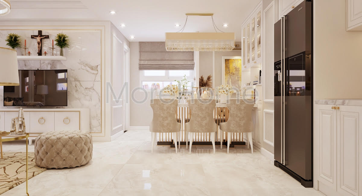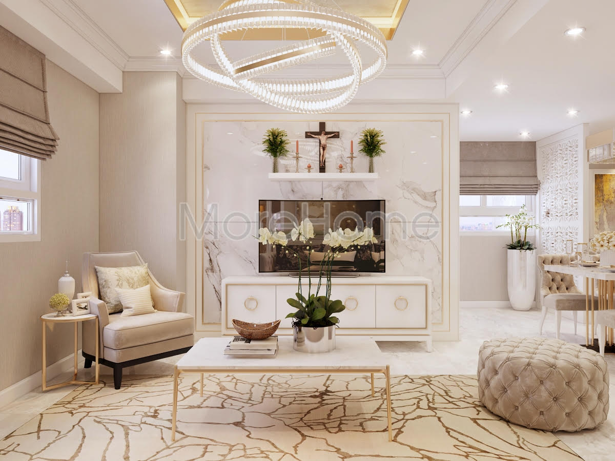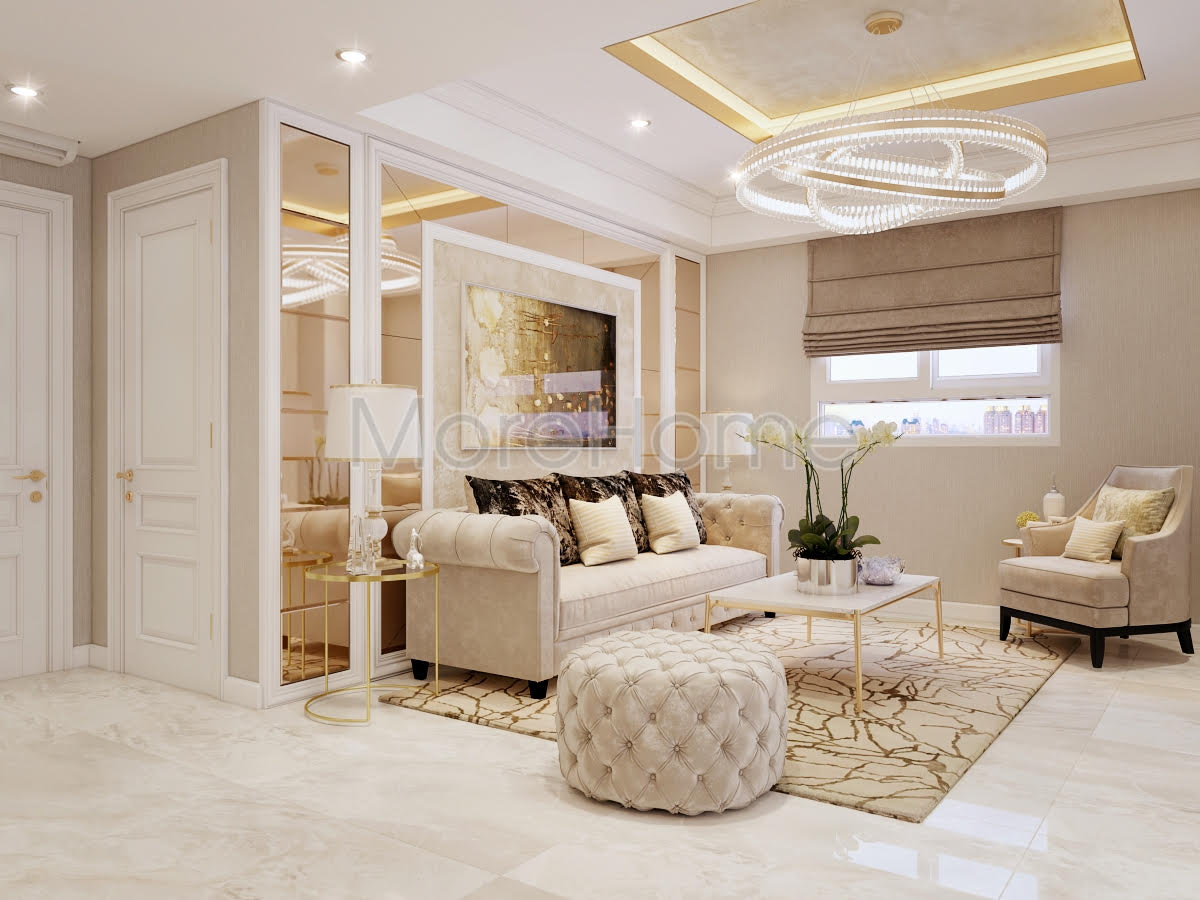 Bạn đang được chiêm ngưỡng mẫu thiết kế nội thất chung cư tân cổ điển do KTS Morehome thực hiện. Đứng trước vẻ đẹp lộng lẫy của căn hộ chung cư 1050 quận Bình Thạnh Tp HCM bạn bị cuốn hút bởi màu sắc và đồ nội thất của căn hộ này.